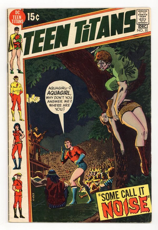 Written by Steve Skeates. Art and cover by Nick Cardy. Mr. Jupiter sends the Teen Titans to get a charitable donation from Mr. Tout, which leads the Teen Titans into discovering the truth behind how Mr. Tout earned his money. Whirlwind text story, script by Steve Skeates, art by Sal Amendola. Written by Steve Skeates. Art by Carmine Infantino and Nick Cardy. Aqualad and Aquagirl go to a rock concert. Animal Wonderland fact two-pager by Martin Naydel. 36 Pages, Full Color. Cover price $0.15.