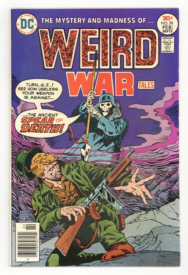 Cover pencils by Ernie Chan [as Ernie Chua], inks by Vince Colletta. An Appointment with Destiny! with Adolph Hitler, script by Steve Englehart, pencils by Dick Ayers, inks by Alfredo Alcala; Spear of Destiny (intro, origin); Set on 30 April 1945 during World War II in Hitler's bunker, as well as in and around Berlin. 36 pgs. $0.30. Cover price $0.30.