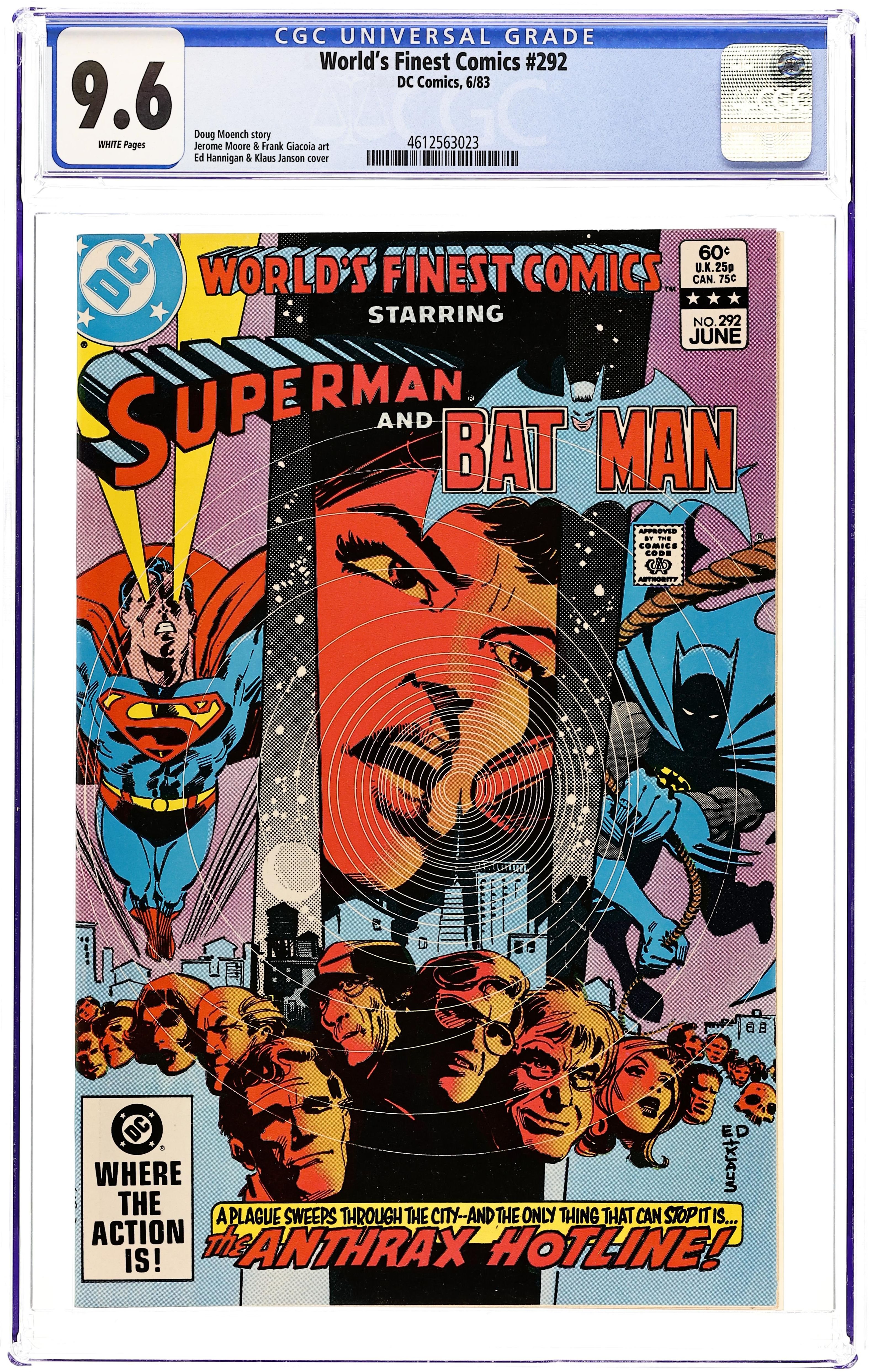 Cover pencils by Ed Hannigan, inks by Klaus Janson. The Anthrax Hotline starring Superman and Batman, script by Doug Moench, pencils by Jerome Moore, inks by Frank Giacoia; a terrorist called Anthrax threatens Gotham City with a germ plague while Superman and Batman appear on a radio show. 36 Pages, Full Color. Cover price $0.60.