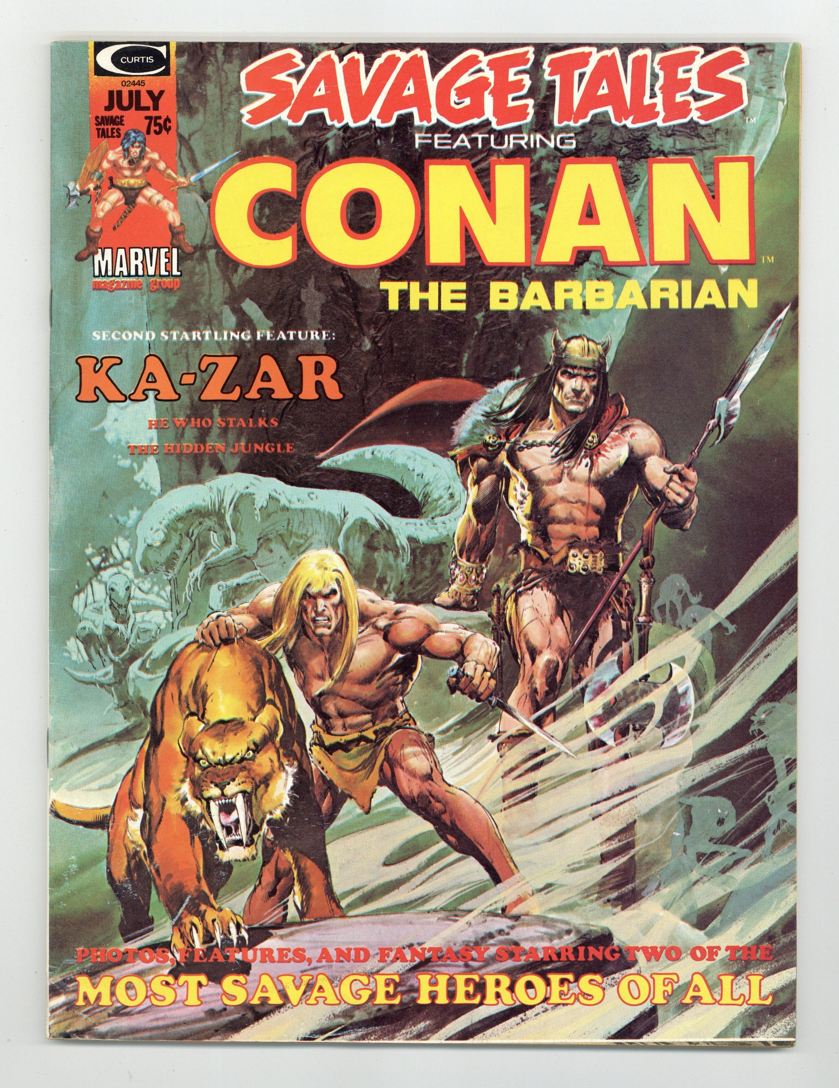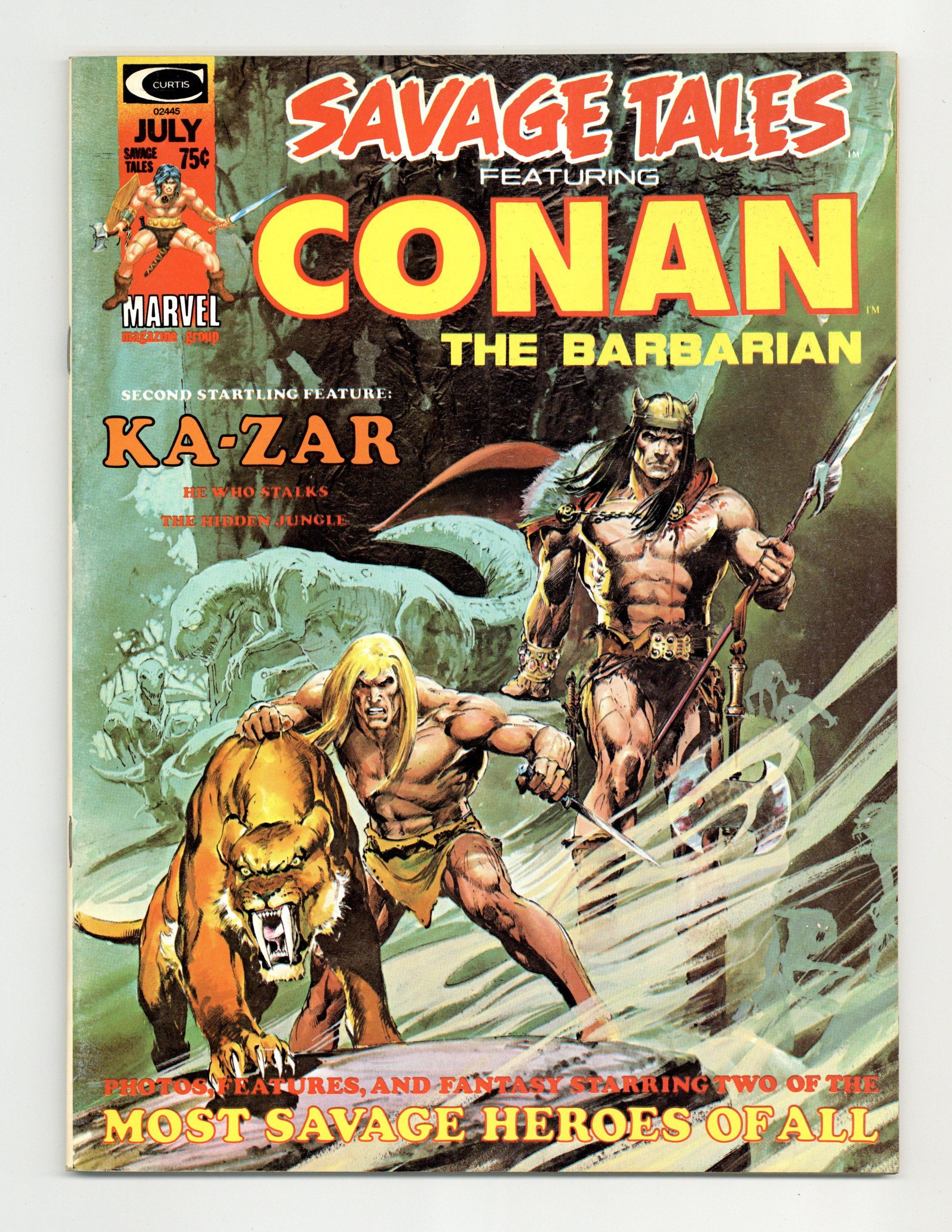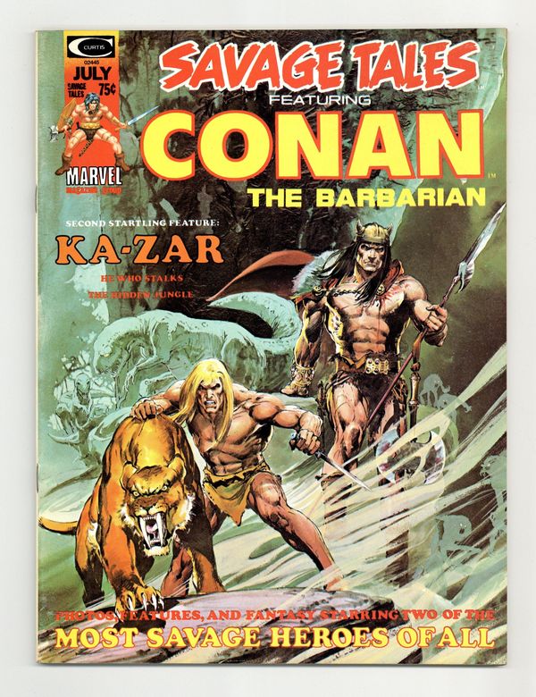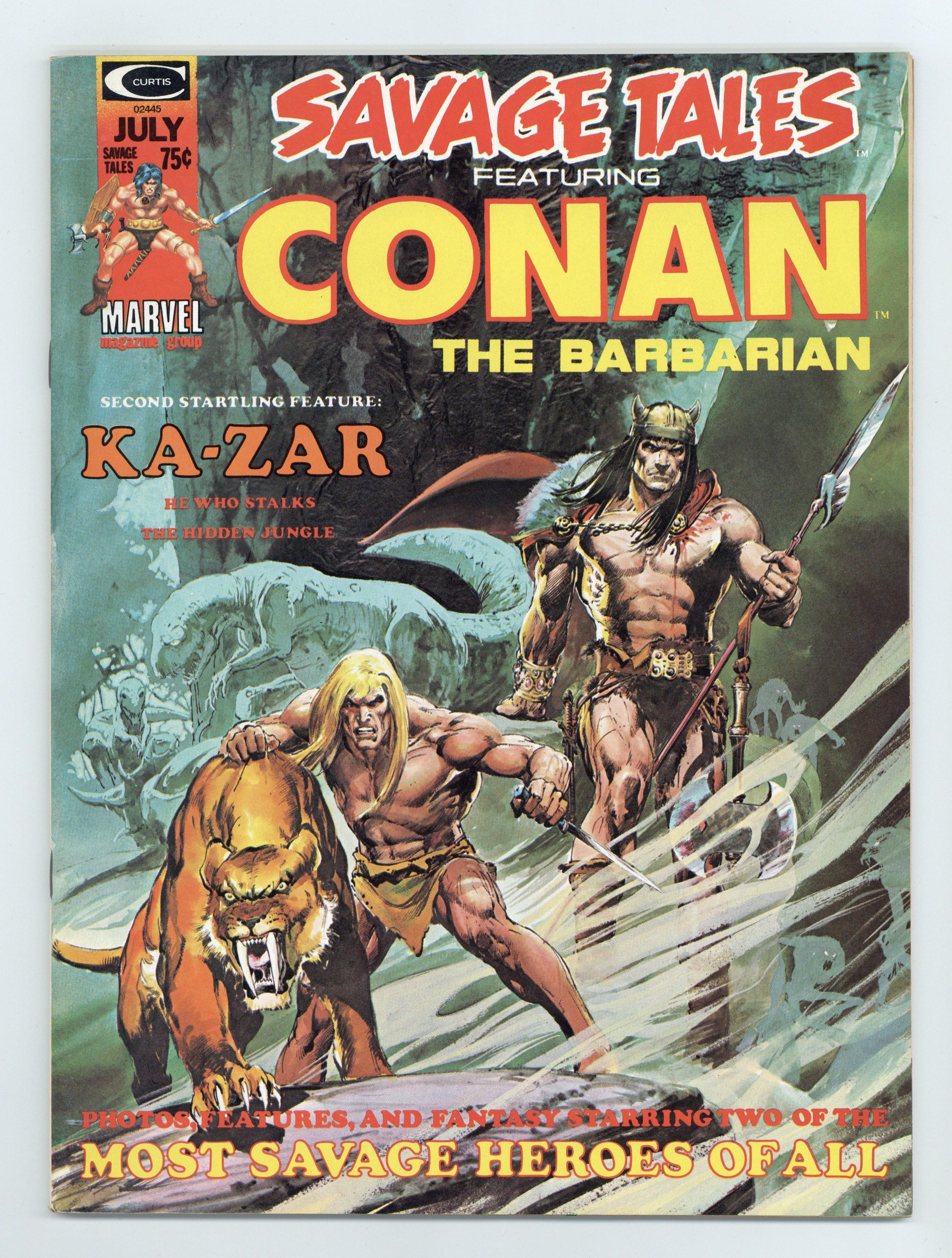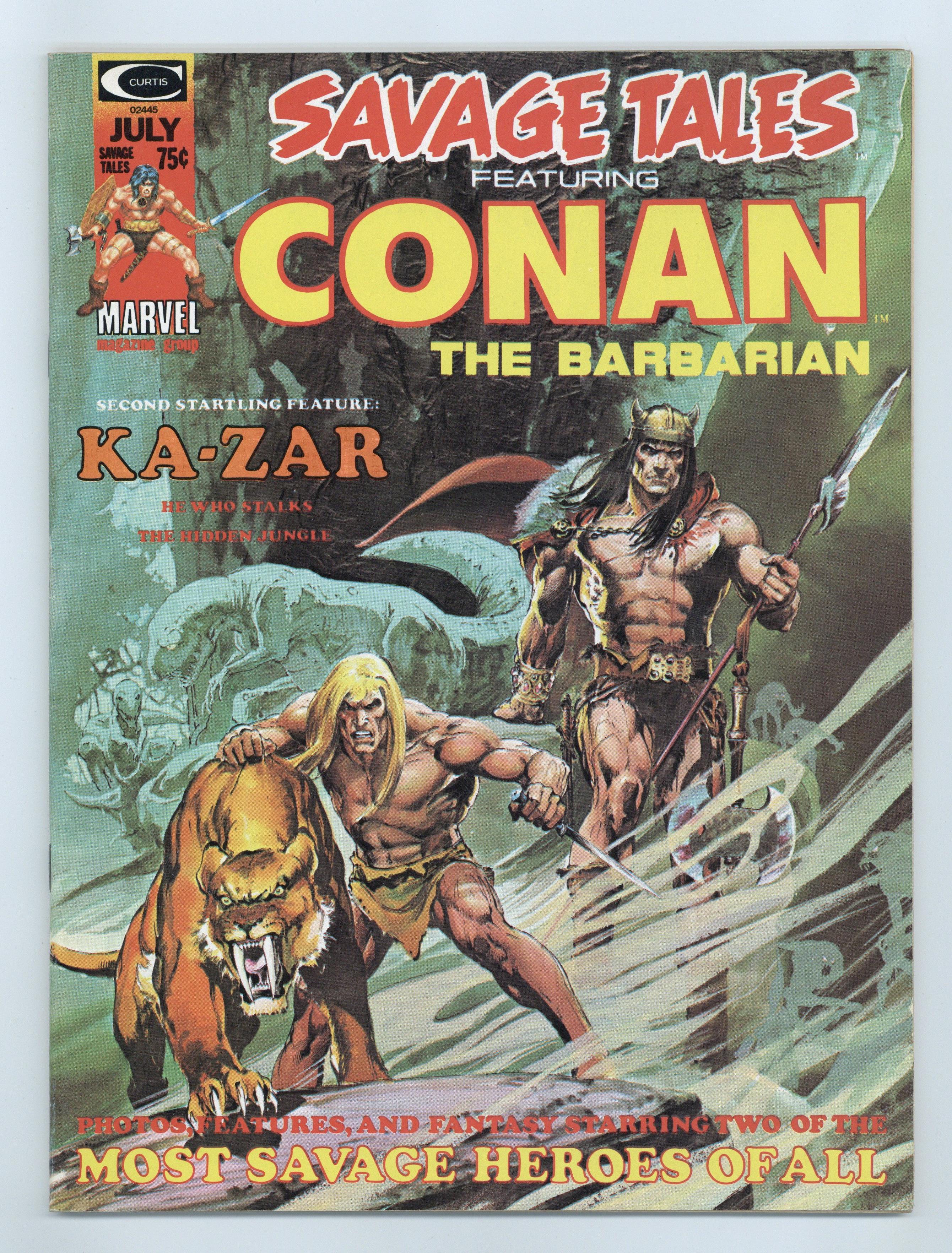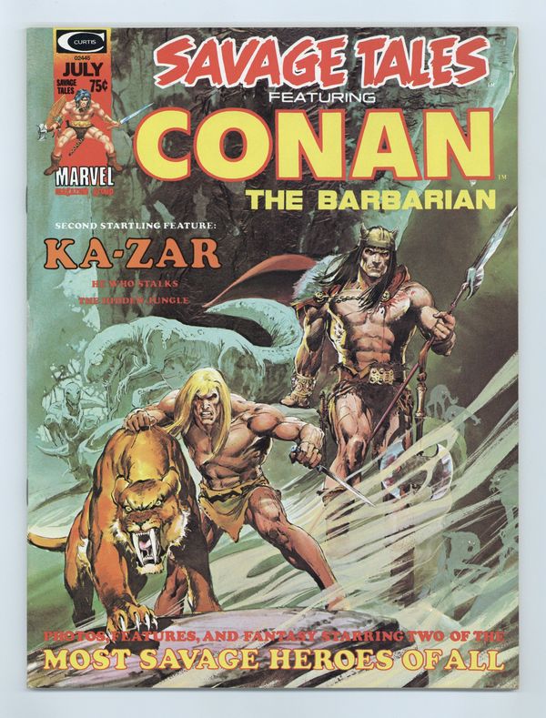 Conan stars in "The Secret of Skull River" (script by John Jakes and Roy Thomas, pencils by Jim Starlin, inks by Al Milgrom). Reprints: Brak the Barbarian stars in "Spell of the Dragon" (script by Dan Adkins and John Jakes; pencils by Adkins and Val Mayerik; inks by Joe Sinnott; from Chamber of Chills 2); and Ka-Zar stars in "The Legend of the Lizard Men" (art by John Buscema; from Astonishing Tales 9). Tony DeZuniga illustration. Neal Adams cover painting. Cover price $0.75.