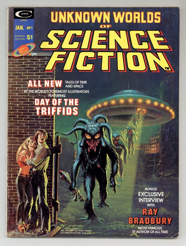 $30.00Cover by Kelly Freas and John Romita. "Slow Glass." 5 pages. Concept by Bob Shaw. Script by Tony Isabella. Pencils by Gene Colan. Inks by Tom Palmer. Framing sequence for stories in anthology. "Day of the Triffids." 15 pages. Part 1 of 2. Based on the book by John Wyndham. Script by Gerry Conway. Pencils by Ross Andru. Inks by Ernie Chua. After a meteor shower blinds almost everyone on Earth, giant mobile plants called Triffids attempt to finish off the human race. "A view from without." 8 pages. Story and art by Neal Adams. Humanitys propensity for war and self destruction is examined by an impartial alien observer. Interview with author Ray Bradbury. 10 pages. "Smash Gordon." 4 pages. Story and art by Frank Brunner. Flash Gordon spoof. "Savage world." 8 pages. Story by Wally Wood. Art by Al Williamson. An atomic bomb test leads to an encounter with a subterranean race. Interview with artist Kelly Freas. 4 pages. "Hey buddy, can you lend me a…." 5 pages. Story and art by Mike Kaluta. The last people on Earths fate rests on… a phone call. "Light of other days." 7 pages. Based on a story by Bob Shaw. Script by Tony Isabella. Pencils by Gene Colan. Inks by Mike Esposito. A substance called slow glass allows a couple to see the past. But there is no guarantee theyll enjoy what they see. 80 pages. B&W. Cover price $1.00.