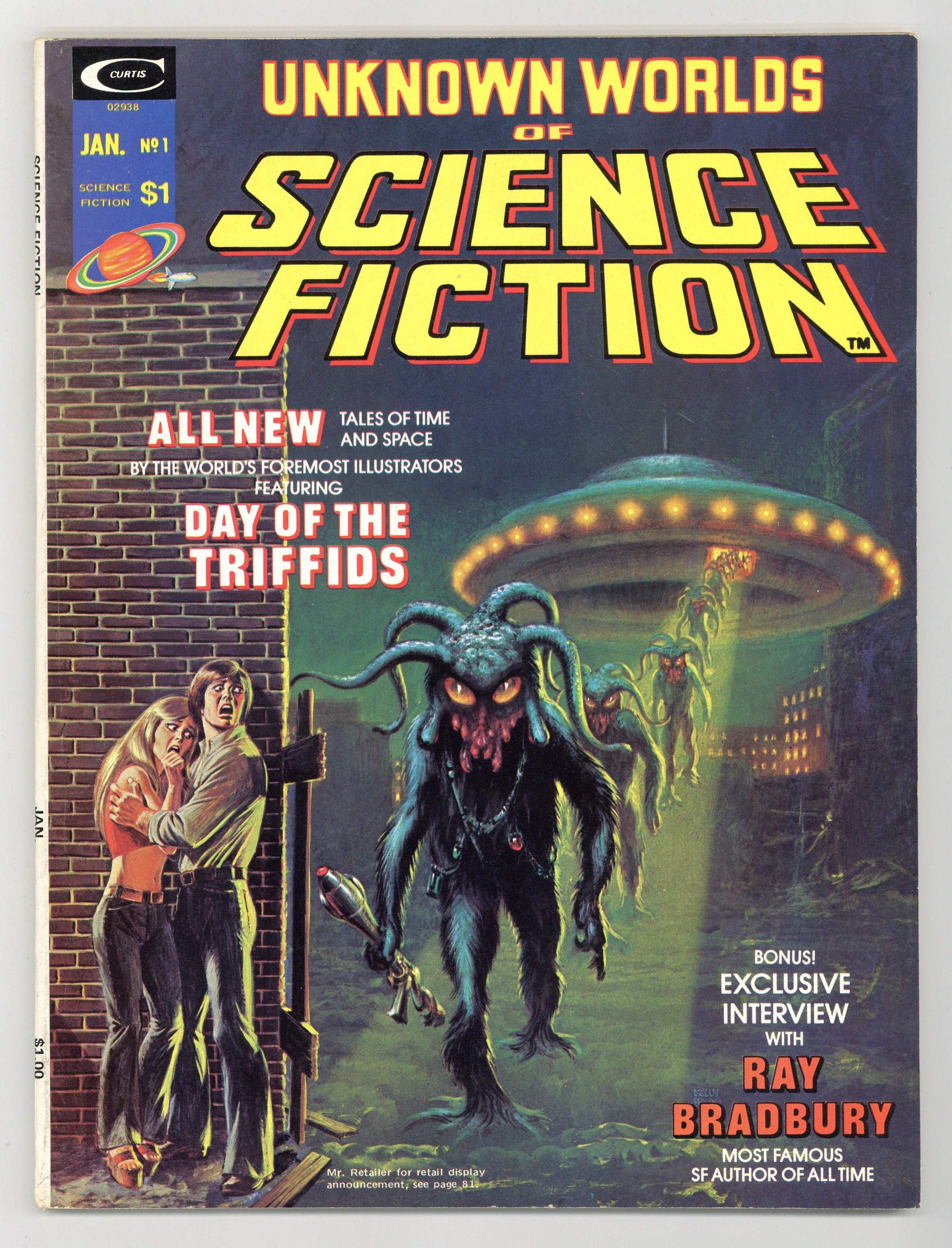 Cover by Kelly Freas and John Romita. "Slow Glass." 5 pages. Concept by Bob Shaw. Script by Tony Isabella. Pencils by Gene Colan. Inks by Tom Palmer. Framing sequence for stories in anthology. "Day of the Triffids." 15 pages. Part 1 of 2. Based on the book by John Wyndham. Script by Gerry Conway. Pencils by Ross Andru. Inks by Ernie Chua. After a meteor shower blinds almost everyone on Earth, giant mobile plants called Triffids attempt to finish off the human race. "A view from without." 8 pages. Story and art by Neal Adams. Humanitys propensity for war and self destruction is examined by an impartial alien observer. Interview with author Ray Bradbury. 10 pages. "Smash Gordon." 4 pages. Story and art by Frank Brunner. Flash Gordon spoof. "Savage world." 8 pages. Story by Wally Wood. Art by Al Williamson. An atomic bomb test leads to an encounter with a subterranean race. Interview with artist Kelly Freas. 4 pages. "Hey buddy, can you lend me a…." 5 pages. Story and art by Mike Kaluta. The last people on Earths fate rests on… a phone call. "Light of other days." 7 pages. Based on a story by Bob Shaw. Script by Tony Isabella. Pencils by Gene Colan. Inks by Mike Esposito. A substance called slow glass allows a couple to see the past. But there is no guarantee theyll enjoy what they see. 80 pages. B&W. Cover price $1.00.