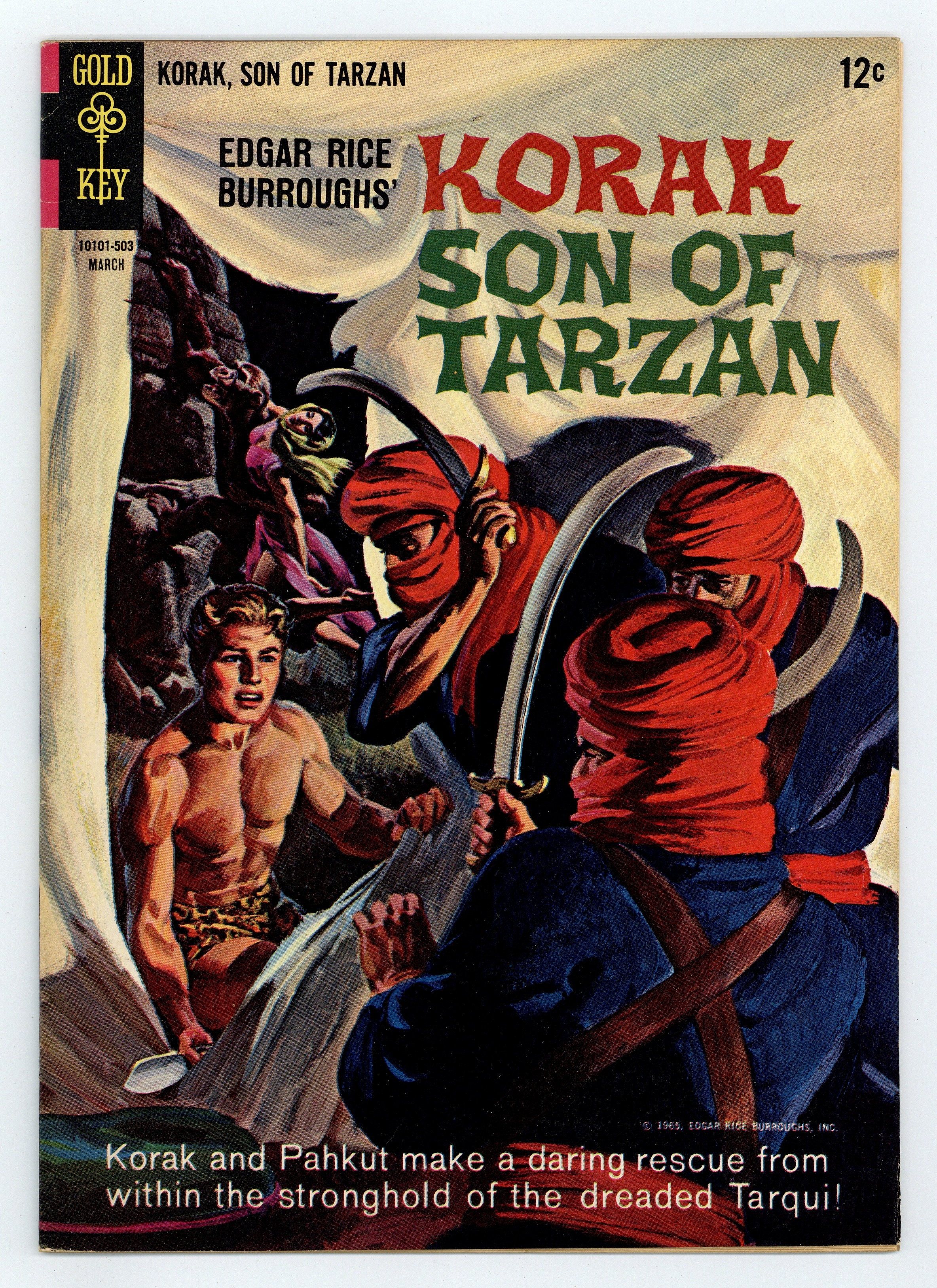 Published Mar 1965 by Gold Key/DC.$18.00Painted cover art by Morris Gollub. "Wild Animals of Africa, Number 16: Greater Kudu" Keys of Knowledge non-fiction page, art by Joe Certa. "Challenge of the Avengers," script by Gaylord Du Bois, art by Russ Manning; Korak rescues a warrior from two lions, three French soldiers from thirst, and the warriors sister from a forced marriage with her abductor. "King of Beasts" starring Jon of the Kalahari, script by Gaylord Du Bois, art by Jesse Marsh. "Wild Animals of Asia, Number 2: Cobra" Keys of Knowledge non-fiction page, art by Joe Certa. Korak, Son of Tarzan pinup by Morris Gollub (same as cover but without logo or lettering). 36 pgs., full color. Cover price $0.12.