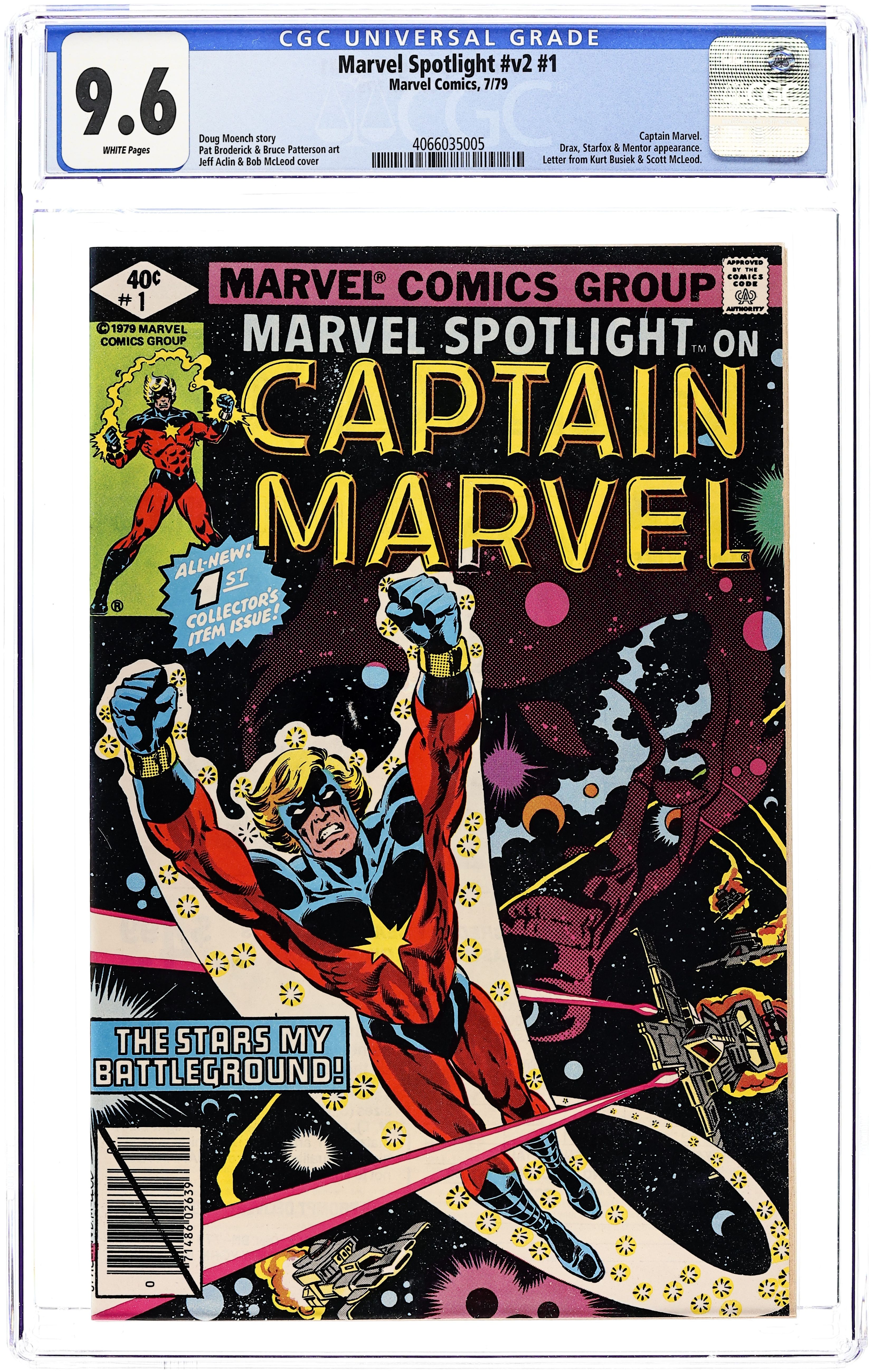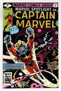 Standard Direct Edition. Marvel Spotlight on Captain Marvel - Return to Titan: part 1 of 2 - "The Saturn Storm!" Guest-starring Drax the Destroyer. Starfox cameo. Written by Doug Moench. Art by Pat Broderick and Bruce Patterson. Cover by J. Aclin and Bob McLeod. MAR-VELL - an alien warrior of the ancient Kree race! With powers given him as Protector of the Universe, he seeks to defend Earth, the planet he has made his own! Picking up after the events of Captain Marvel (1968-1979 1st Series Marvel) #62, Mar-Vell, Rick Jones, Gertie and Drax the Destroyer head to the Saturn moon of Titan and comer under siege. What power in the galaxy could have possibly humbled the Eternals of Titan? The answer may prove to be the good Captain's end. 32 pages, FC. Cover price $0.40.