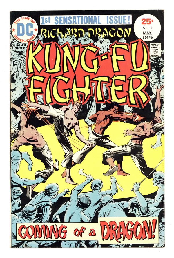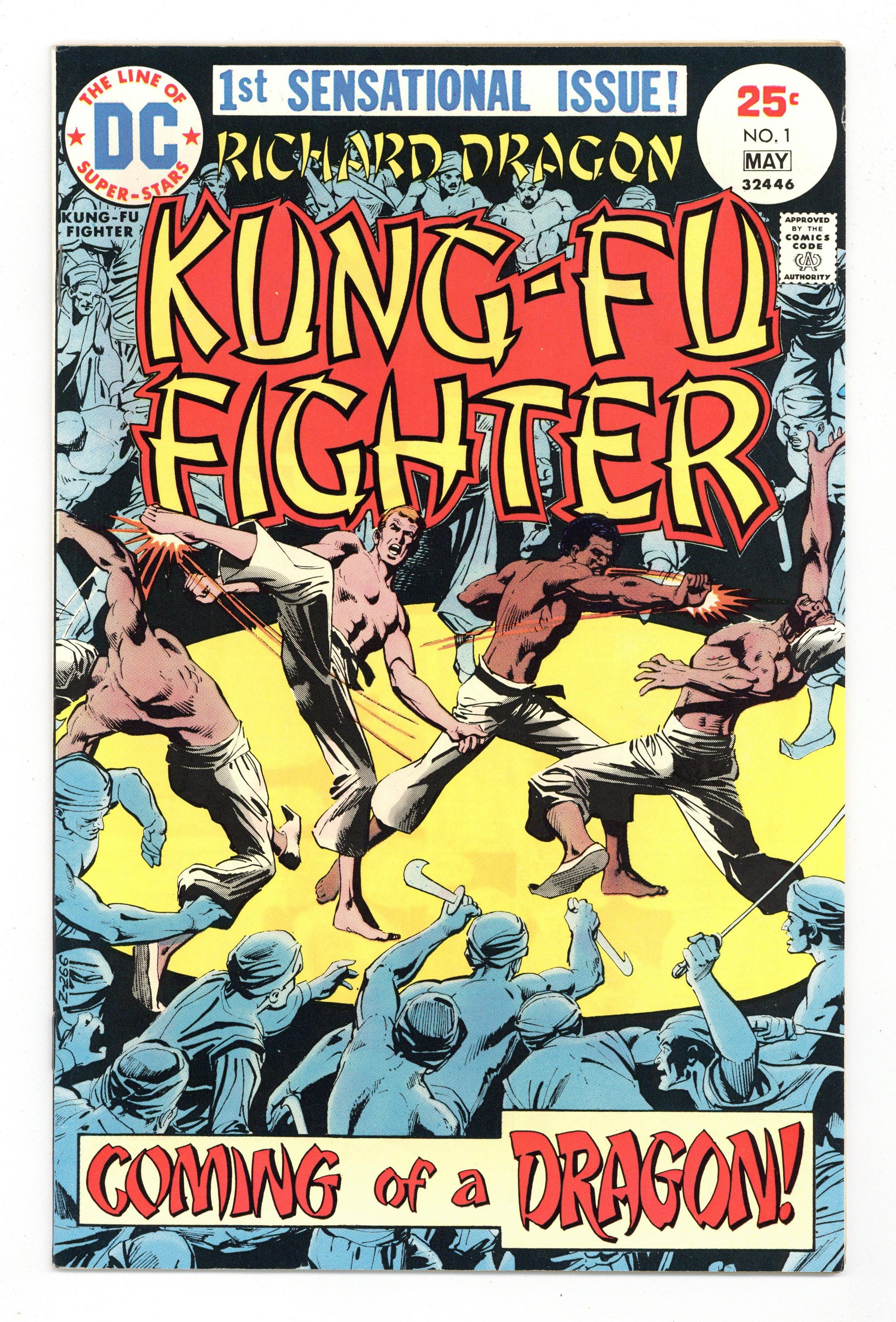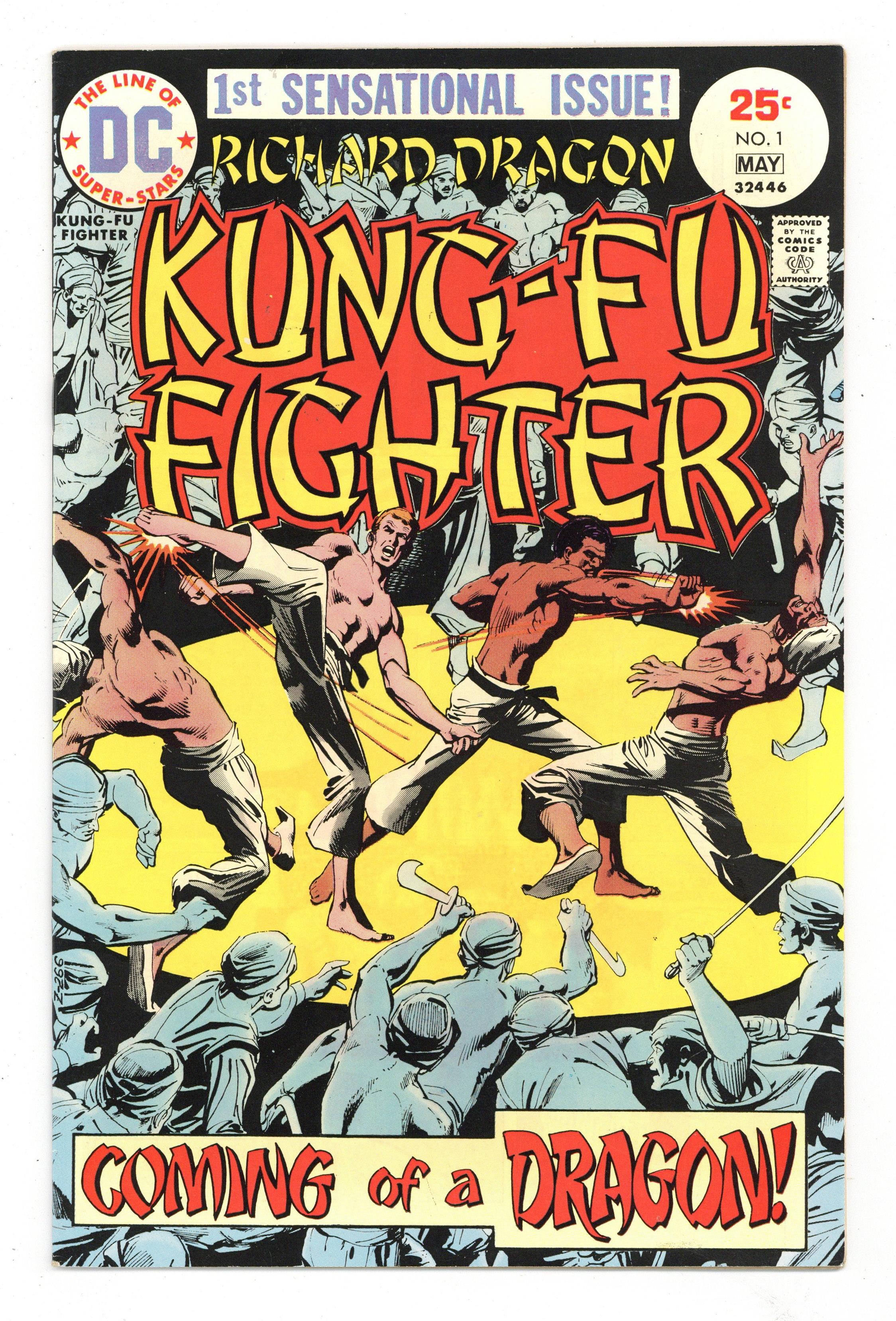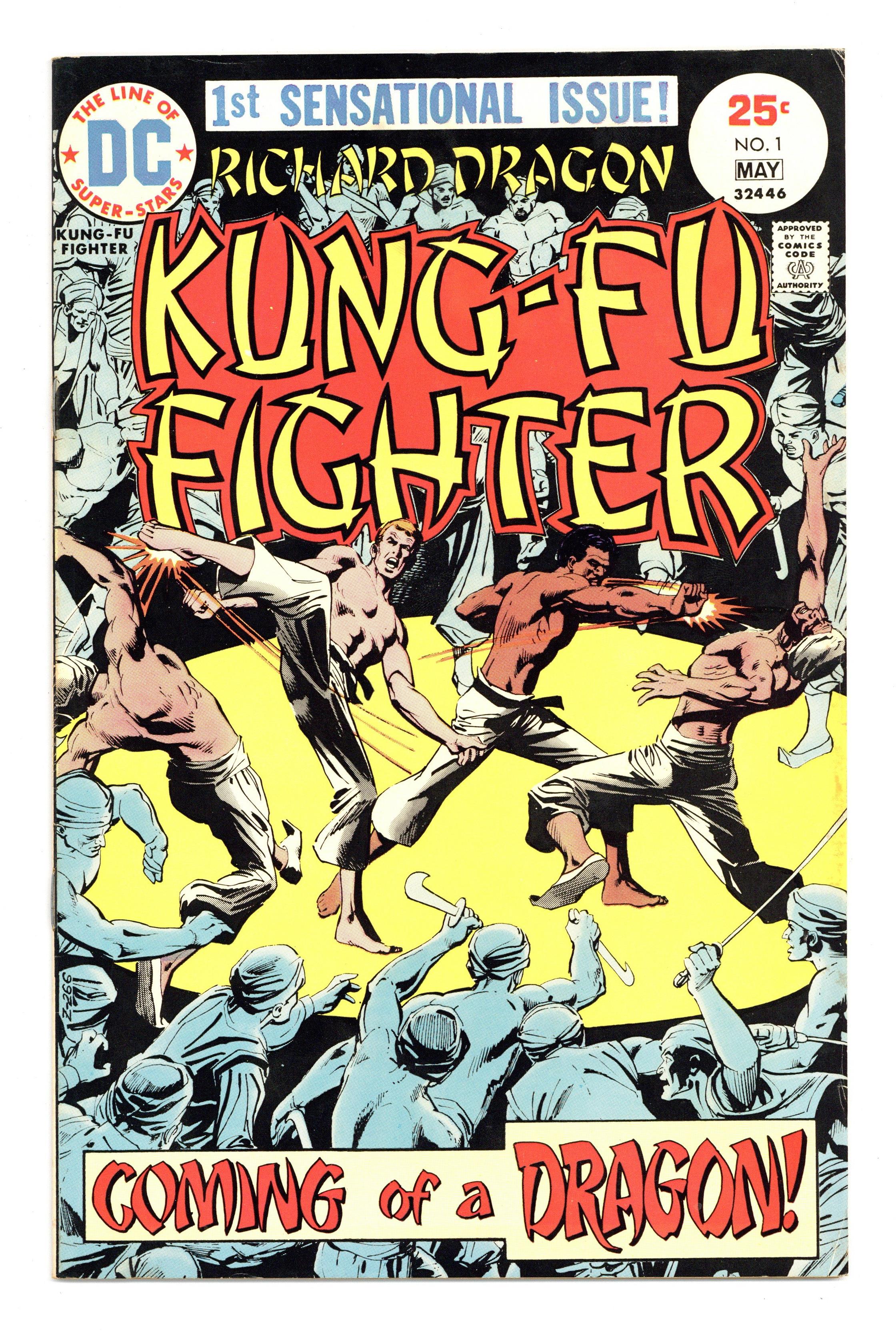Cover art by Dick Giordano. Coming of a Dragon! starring Richard Dragon, Kung Fu Fighter (1st appearance), O-Sensei, Benjamin Turner (intro, later becomes the Bronze Tiger), script by Jim Dennis, art by Leopoldo Duranona; martial arts action based on the novel, Dragon's Fists. 32 pgs. $0.25. Cover price $0.25.