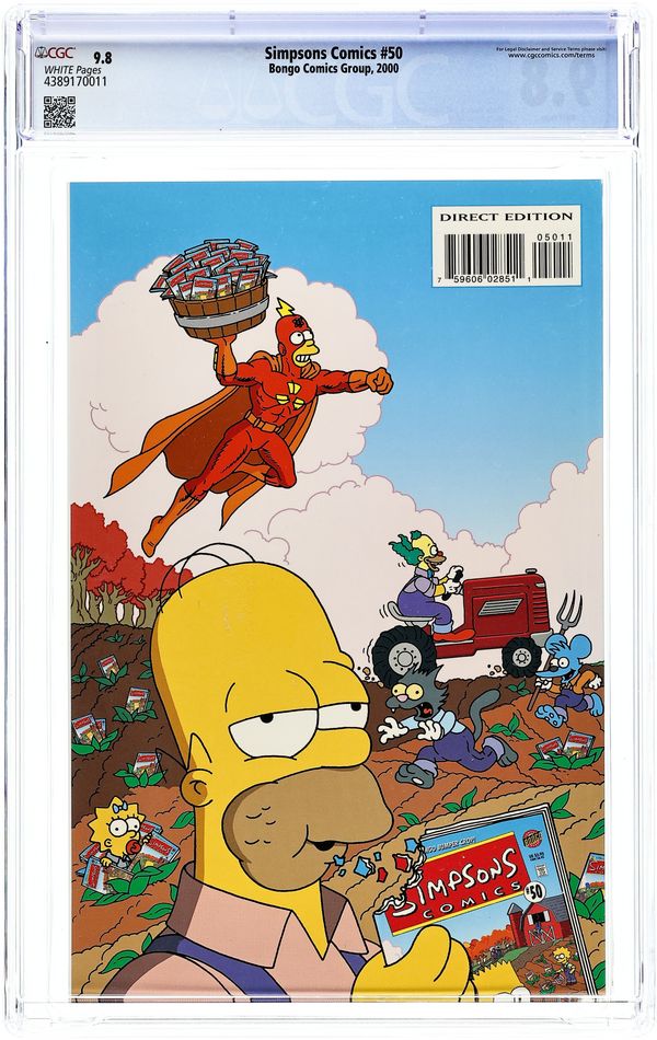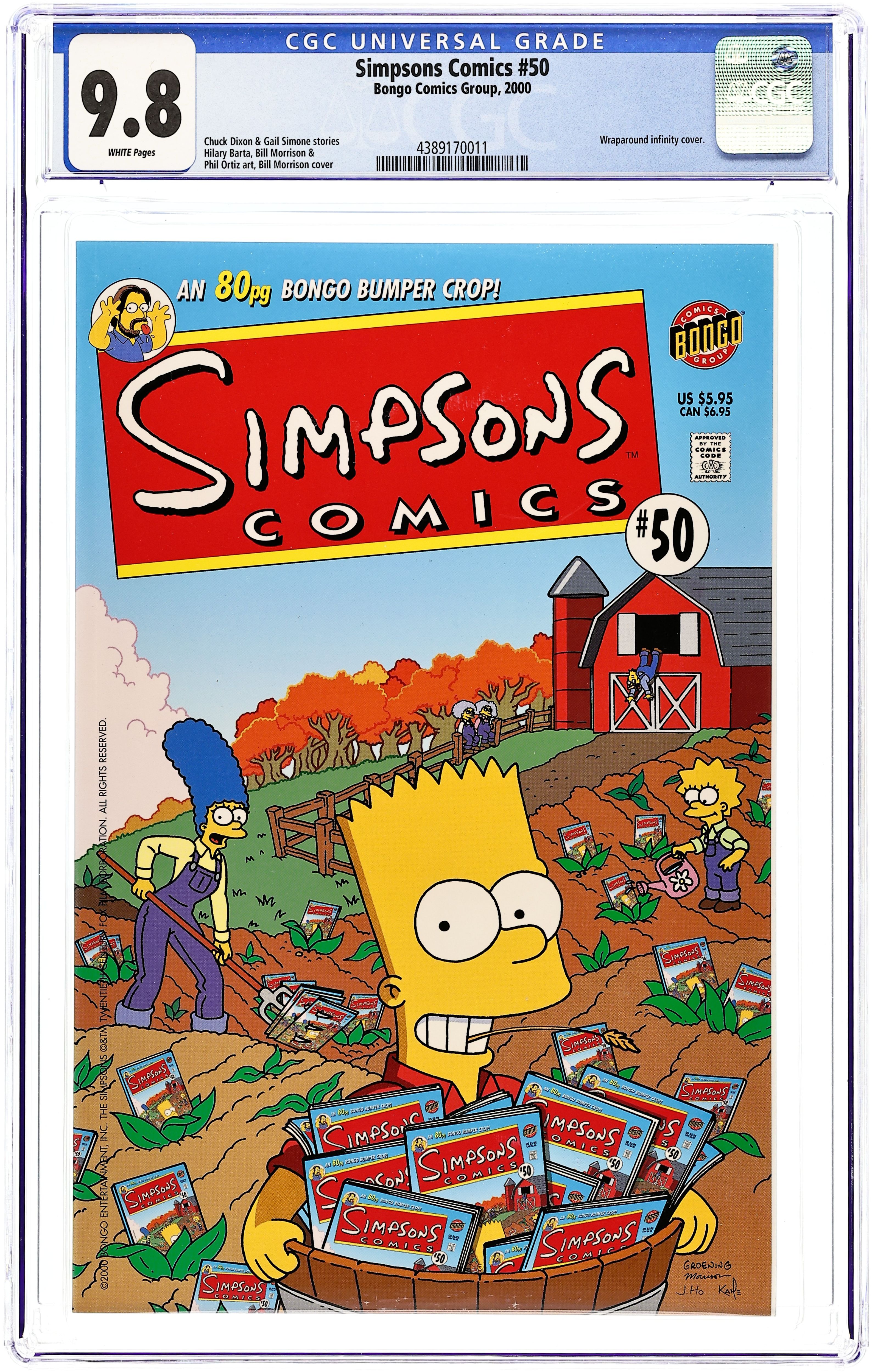 by Matt Groening & Bill Morrison Bongo celebrates this milestone issue with an all-new, all-art, no ads, 80-page, Prestige Format issue with a wraparound cover! To honor each of the Simpsons titles released over the past seven years, this spectacular issue includes stories about the Simpsons, Bartman, Radioactive Man, Itchy & Scratchy, Lisa, and Krusty the Clown ? with some extra material thrown in. Aided and abetted by some of comicdom's finest talents, Simpsons Comics turns 50 in style. See Batman scribe Chuck Dixon tackle Bartman; Scott Cunningham, Vertigo's master of grisly humor, takes on Itchy & Scratchy; Hilary Barta, lately of Hellboy, Jr. and Splash Brannigan, debuts as a Radioactive Man artist; and Gail Simone, the rising star at Comic Book Resources and You'll All Be Sorry columnist, deftly handles Lisa Simpson. Squarebound/Prestige Format. FC, 80pg Cover price $5.95.