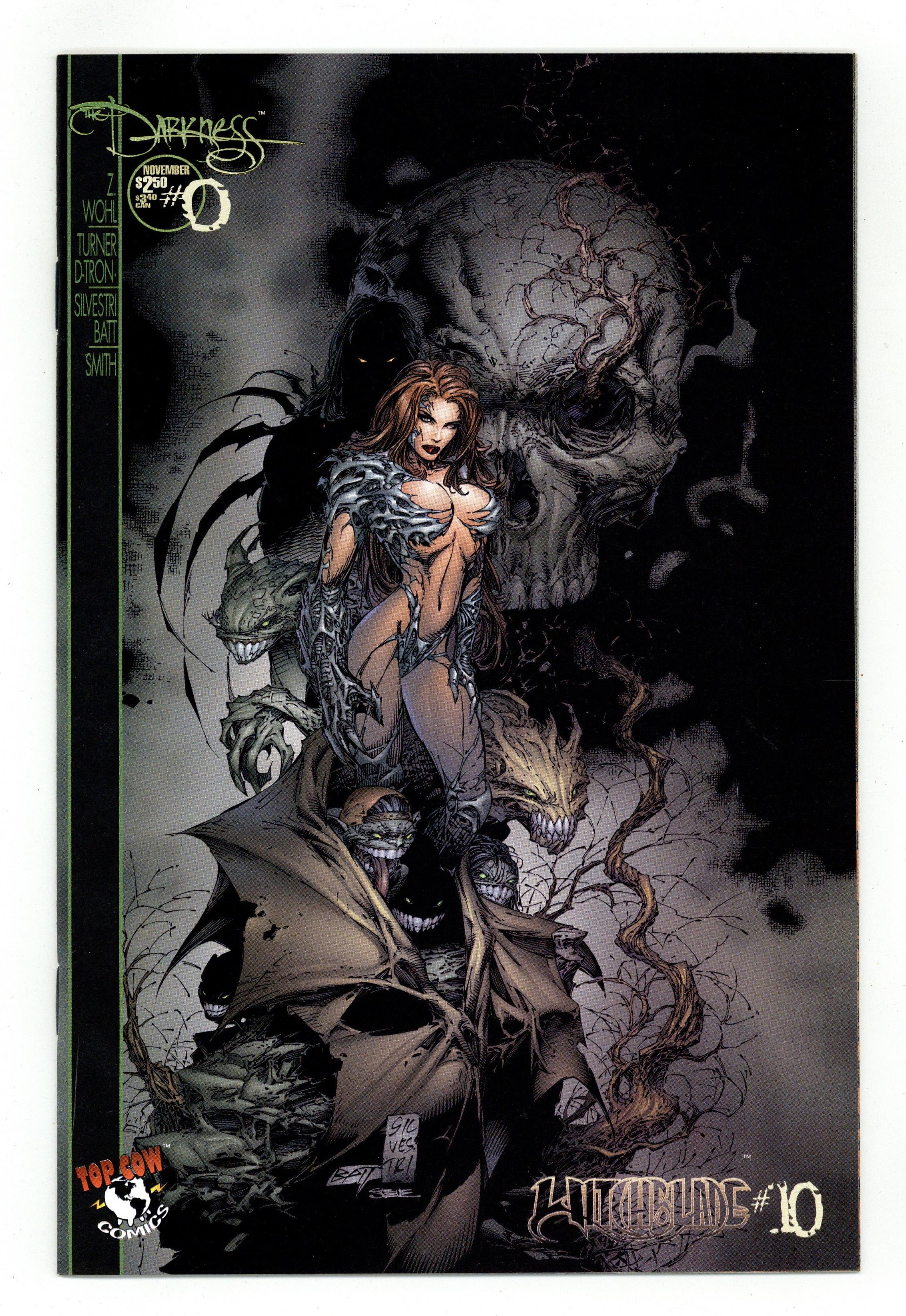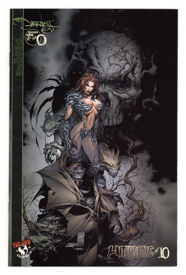 1st appearance of The Darkness. Variant cover pencils by Marc Silvestri, inks by Matt Banning. Witchblade & The Darkness, script by Marc Silvestri (Co-Plot), Christina Z, and David Wohl, pencils by Michael Turner (pgs. 1-6, 11-22) and Marc Silvestri (pgs. 7-10), inks by D-Tron (pgs. 1-6, 11-22), Matt Banning (pgs. 7-10), Jose Guillen (Assistant), Viet Truong (Assistant), and Jeff Crumpler (Assistant); Mob enforcer Jackie Estacado enters Sara's life and when she tries to bring him down, the Witchblade doesn't want to cooperate. The Witchblade & The Darkness Pin-Up, pencils by Billy Tan Mung Khoy, inks by D-Tron. 36 pgs. $2.50. Cover price $2.50.