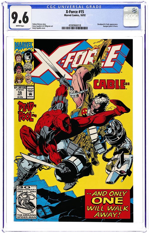 Direct Edition. Cover pencils by Greg Capullo, inks by Harry Candelario. To The Pain, script by Fabian Nicieza, pencils by Greg Capullo, inks by Al Milgrom; X-Force rescues Sunspot who joins the team; Cable rips through Deadpool and Tolliver to free the real Domino (Up to this point, Domino has been a shapeshifter named Vanessa in Tolliver's employ); Cable next appears in Cable: Blood and Metal #1. 36 pgs. $1.25. Cover price $1.25.