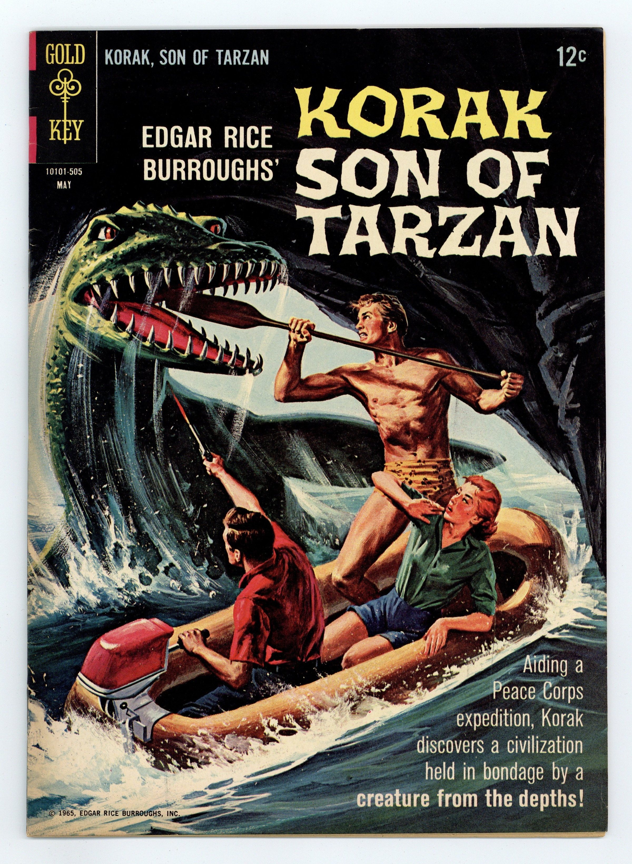 Published May 1965 by Gold Key/DC.$18.00Painted cover art by Morris Gollub. "Wild Animals of Africa, Number 13: Okapi" Keys of Knowledge non-fiction page, art by Joe Certa. "Lair of the Dragon," script by Gaylord Du Bois, art by Russ Manning; Korak rescues three Peace Corps volunteers from a plane wreck, a lost cave city from a water dragon, and the female Peace Corps volunteer from a forced marriage with the overly grateful king. "The Peace Corps: America's Unofficial Ambassadors" article. "Medicine Man," script by Gaylord Du Bois, art by Jesse Marsh. "Lie Detector of Zululand" one-page non-fiction story, art by Tony DiPaola. "Mabudu Money!", art by Tony DiPaola; Information on the Mabudu currency, which is Leopard teeth. "Wild Animals of Asia, Number 3: Elephant" Keys of Knowledge non-fiction story, art by Joe Certa. Korak, Son of Tarzan pinup by Morris Gollub (same as cover but without logo or lettering). 36 pgs., full color. Cover price $0.12.