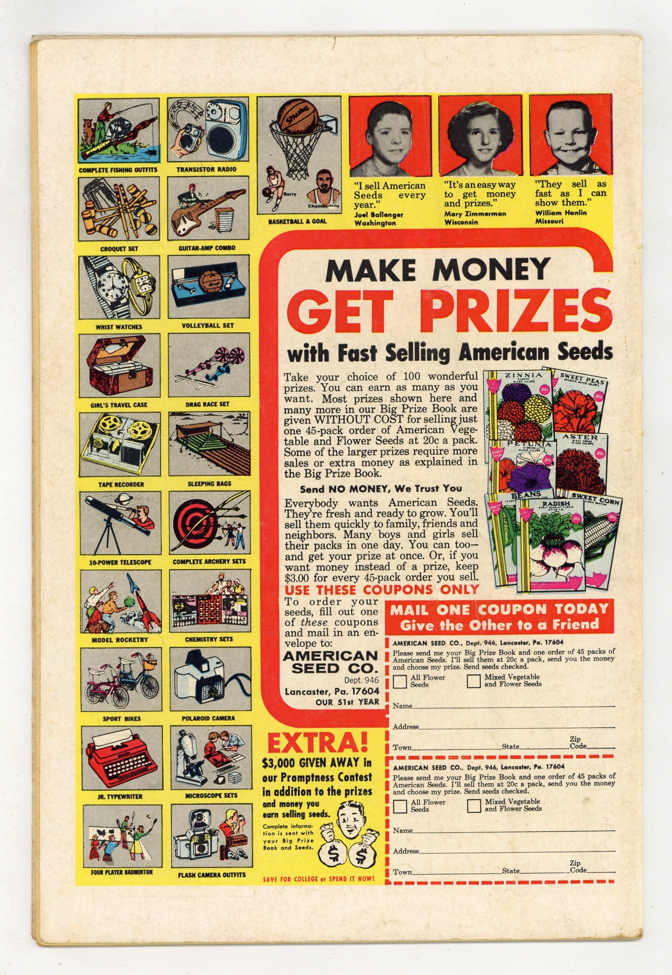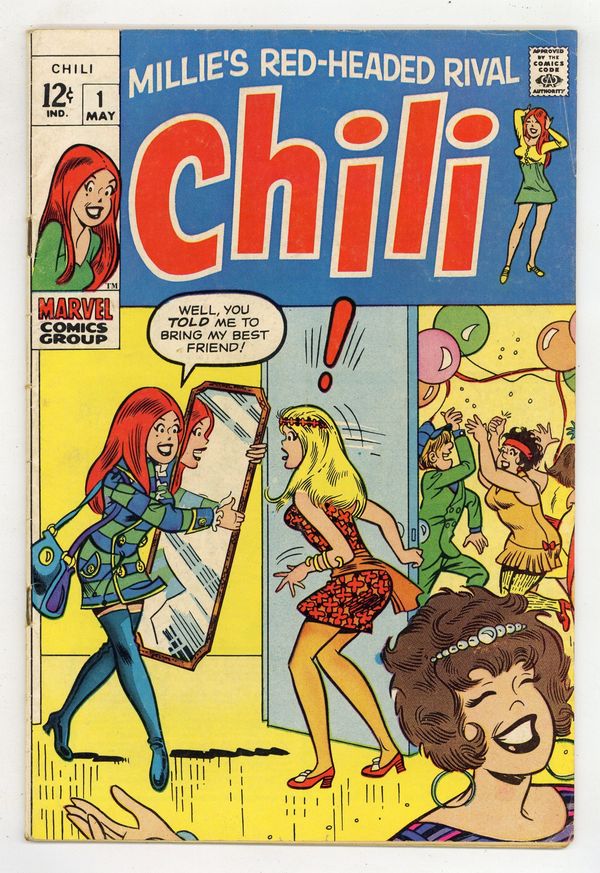 Tags: Archie$19.00The Lady and the Lipstick!; Chili is selected to be the new Lily Lovey lipstick girl, but she runs into a bit of a snag when she goes out to buy some Lily Lovey lipstick to wear to the interview. Two Gals and a Gown!; Chili and Millie fight over who will get to buy an "exclusive" gown. Friends Till the End!; When Chili gets up in the morning she decides to turn over a new leaf and be nice to Millie. The Party Smarty; When Chili is not invited to Millie's hush-hush party she decides to ruin it and tell everyone else that the party has been cancelled. Scripts by Stan Lee, art by Stan Goldberg. 36 pgs. $0.12. Cover price $0.12.