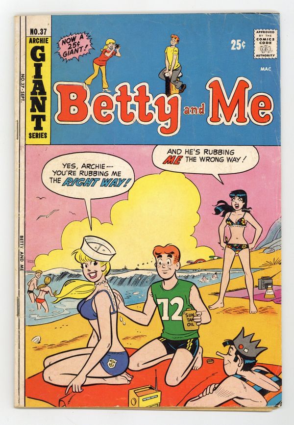 52-page giant. Cover pencils by Dan DeCarlo, inks by Rudy Lapick. "Focus Pocus," script and pencils by Al Hartley, inks by Jon D'Agostino; Betty explains the concept of "love" to Jughead, and why she needs to be there for Archie when Veronica drops him. "She Sells Sea Shells," pencils by Bob Bolling, inks by Jon D'Agostino; Dilton explains sea shells. "A Time in Life," art by Bill Vigoda; Betty runs away with a child whose parents were killed in a plane crash, and Archie and Jughead go looking for her. "Love Story," script and art by Al Hartley; Archie writes a love note for Betty, but Ms. Grundy catches them smooching and gives Archie detention. "Fill It Up," script and art by Joe Edwards; Greg has a customer complaint. Untitled Betty's Diary story, script by George Gladir, pencils by Gus Lemoine, inks by Jon D'Agostino; Betty puts her unique interpretations of the day's events into her diary. "Nite Sprite," script by George Gladir, pencils by Al Hartley, inks by Jon D'Agostino; Betty tries subliminal suggestion with Archie. "T Is for Two-Timer," art by Al Hartley; Scenes from Archie's life are used to illustrate definitions of words. "Sports Award," script by George Gladir, art by Samm Schwartz; Betty's date conflicts with Jughead's plans for Archie, which induces conflict in Betty. 52 pgs., full color. Cover price $0.25.