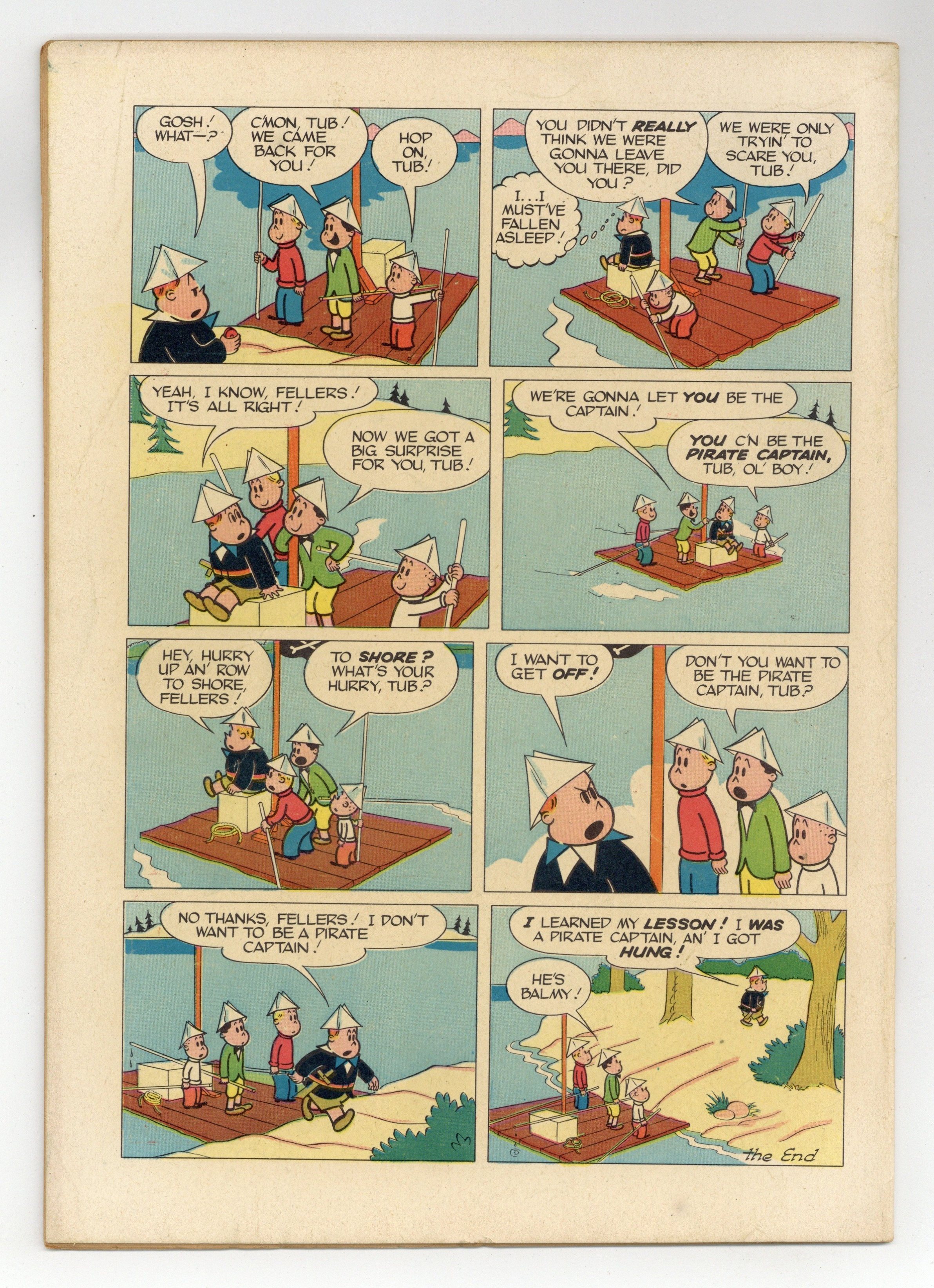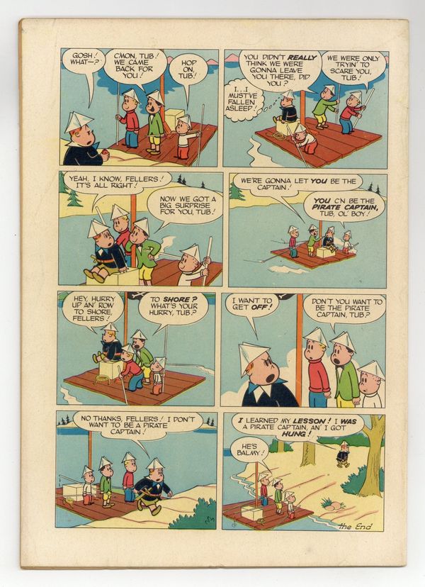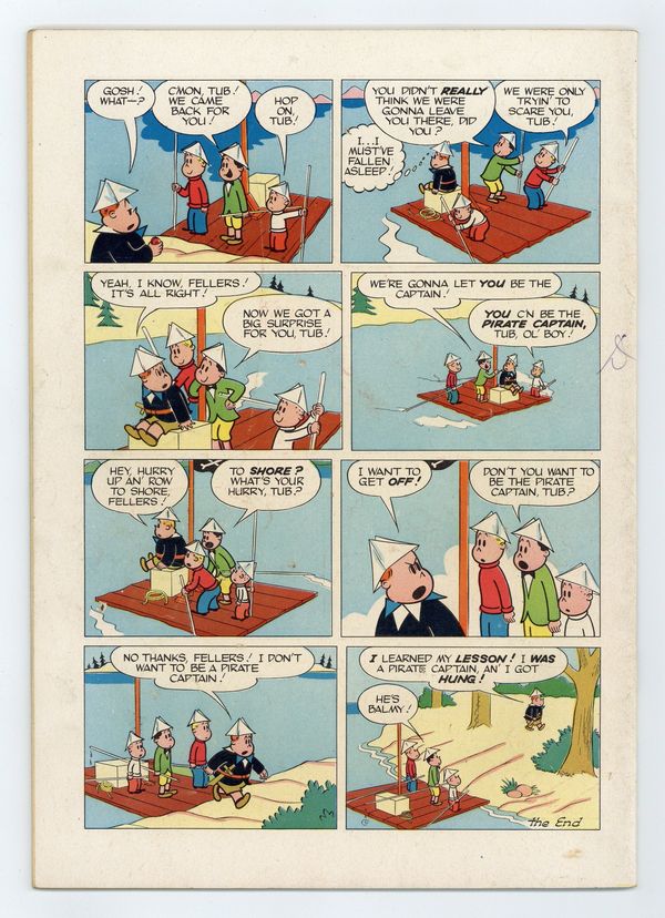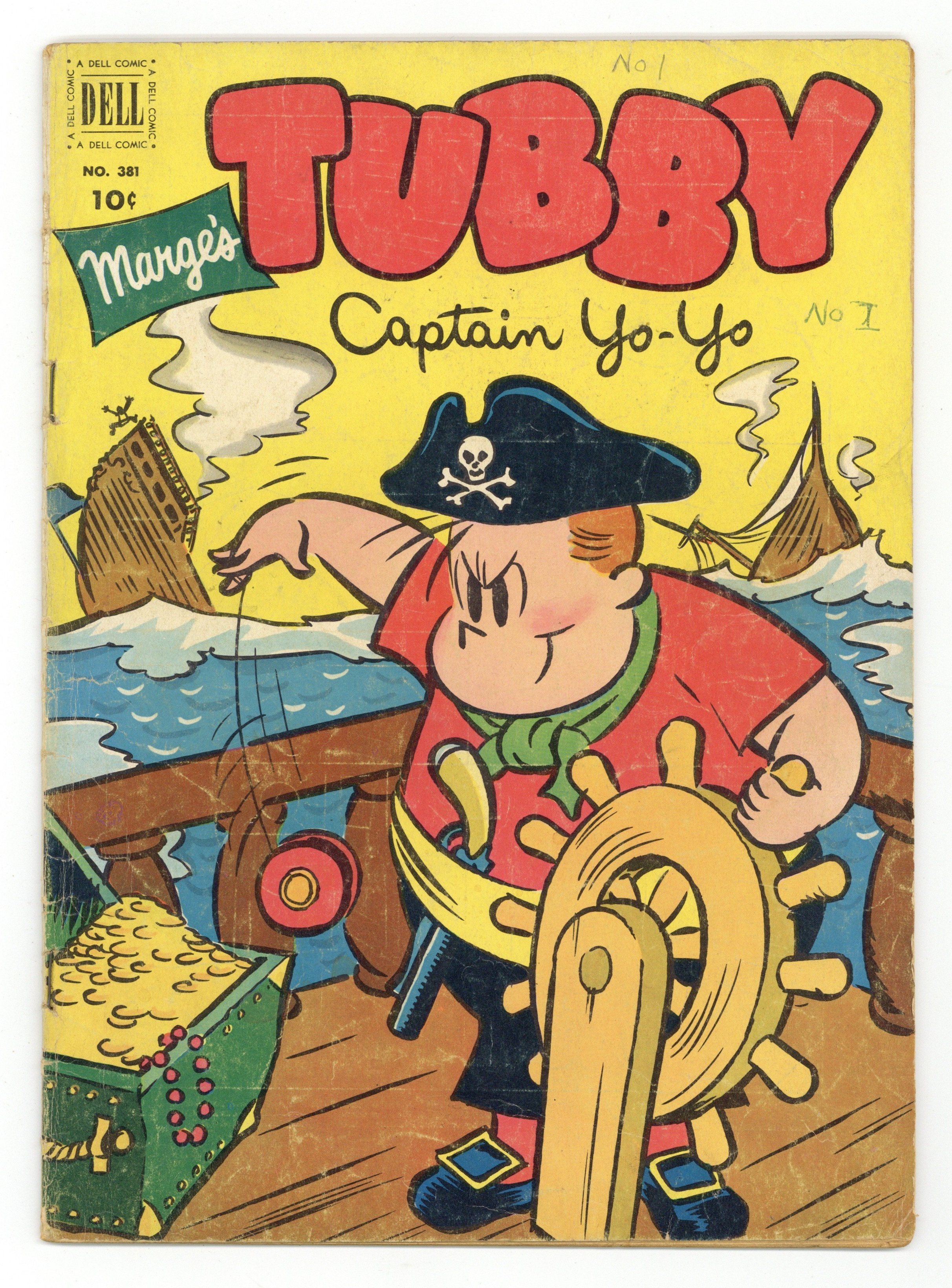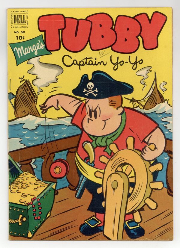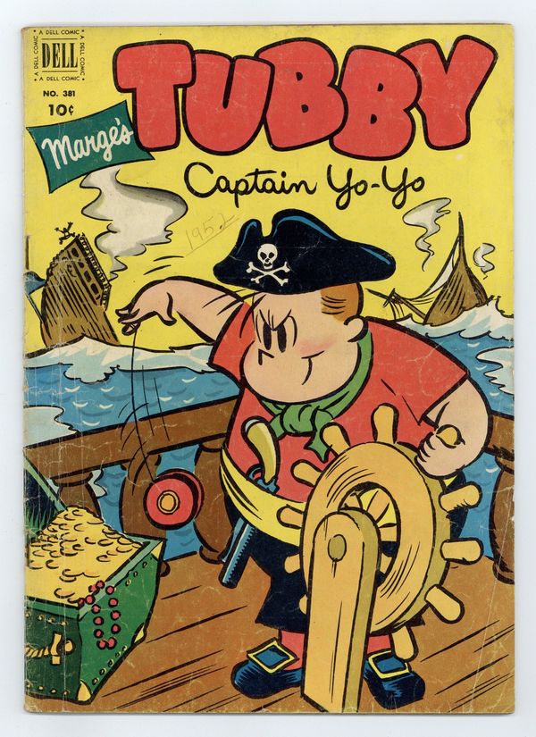 $60.00Marge's Tubby (#1). Indicia title is "MARGE'S TUBBY, CAPTAIN YO-YO, No. 381." Captain Yo-Yo, script by John Stanley; While playing pirate with the gang, Tubby is left marooned on Pine Tree Island. While on the island, he dreams of having adventures as captain of a pirate ship. 36 pages, full color. Cover price $0.10.