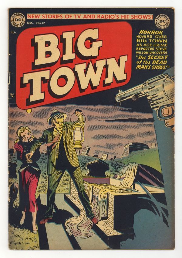 Based on the TV and radio show of the same name, Big Town lasted 50 issues. This installment includes the following: "The Secret of the Dead Man's Shoes!" (Steve and Lorelei investigate a mystery surrounding a corpse's stolen shoes); "Where is Steve Wilson?"; and "A Day in the Life of a Cop!" Scripts by Bill Finger and Miriam Hecht, pencils by John Lehti, inks by Bob Lander and Bernard Sachs. Cover by Alex Toth. Cover price $0.10.