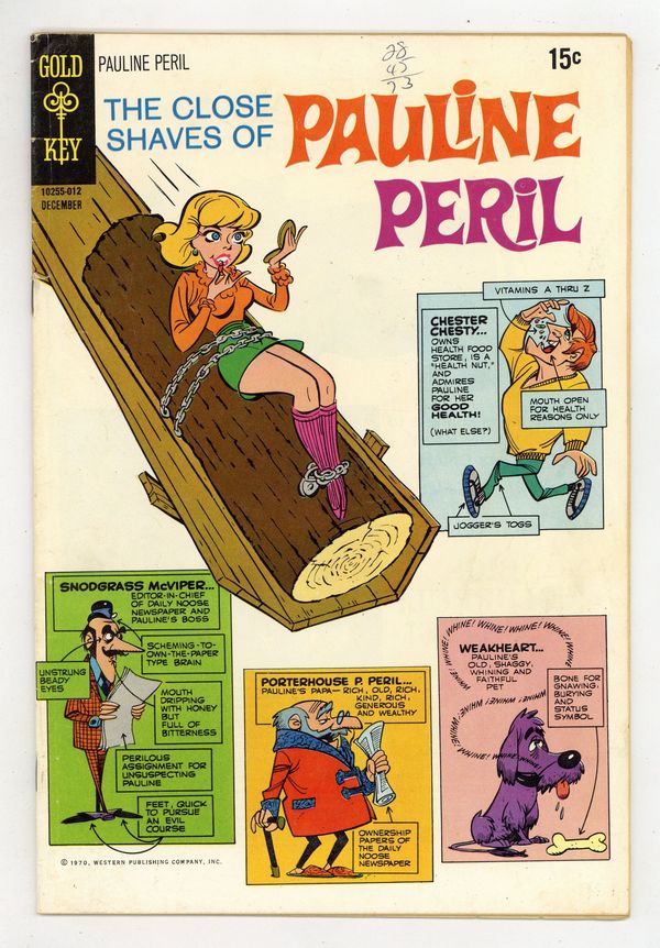 Cover pencils by Jack Manning. You Can't Hang a Coat on a Cliff-Hanger, script by Del Connell, pencils by Jack Manning; Snodgrass wants rid of Pauline so he can inherit the Daily Noose; He puts her through several old movie cliff-hanger situations from which she always escapes; Similar to Road Runner and Dudley Do-Right. Gold Key Club News. Stamp and Coin Collector's Corner. Careers as Oceanographer and Interior Designer public service announcement. 36 pgs. $0.15. Cover price $0.15.