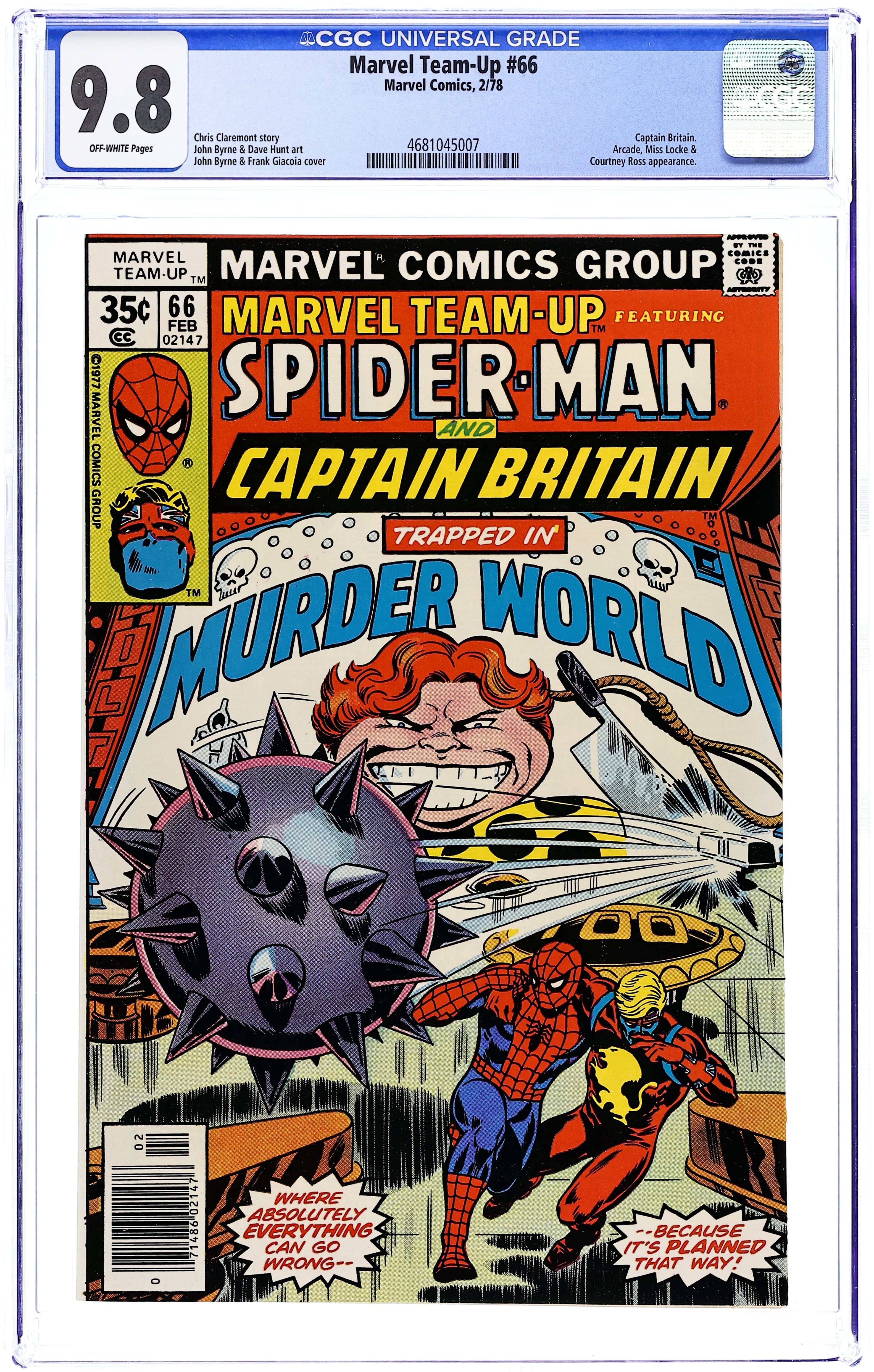 "Murder World" Part 2 of 2. Guest-starring Spider-Man and Captain Britain. Script by Chris Claremont. Pencils by John Byrne. Inks by Dave Hunt. Cover by John Byrne and Frank Giacoia. Captain Britain and the Spectacular Spider-Man wake up inside a giant pinball machine! The two heroes are trapped in Murderworld...an amusement park for murder! Can the web-slinger and Captain Britain beat Arcade at his own game? And also save Courtney Ross in the process? First appearance of Murderworld. Cameo appearance by Captain Jean DeWolff. (Notes: Arcade appears next in Uncanny X-Men 122. This two-part story was reprinted in Marvel Tales 201 and 202.) 36 pages. Cover price $0.35.