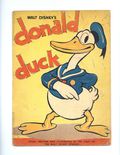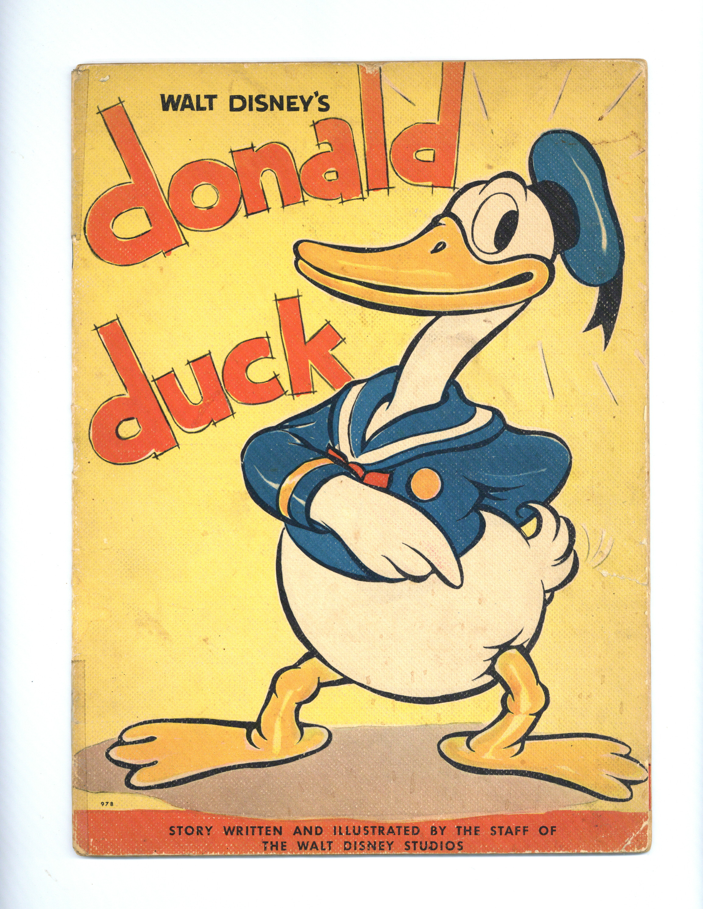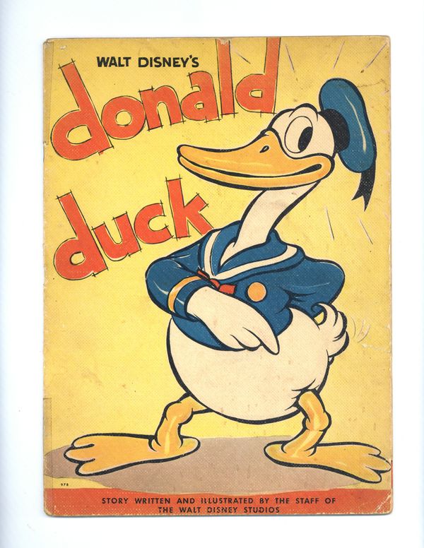 $375.00Whitman #978, 1935. First book ever devoted to Donald Duck. Text story with a large illustration on every page. 9 1/2-in. x 12 3/4-in., 16 textured linen pages, full color.