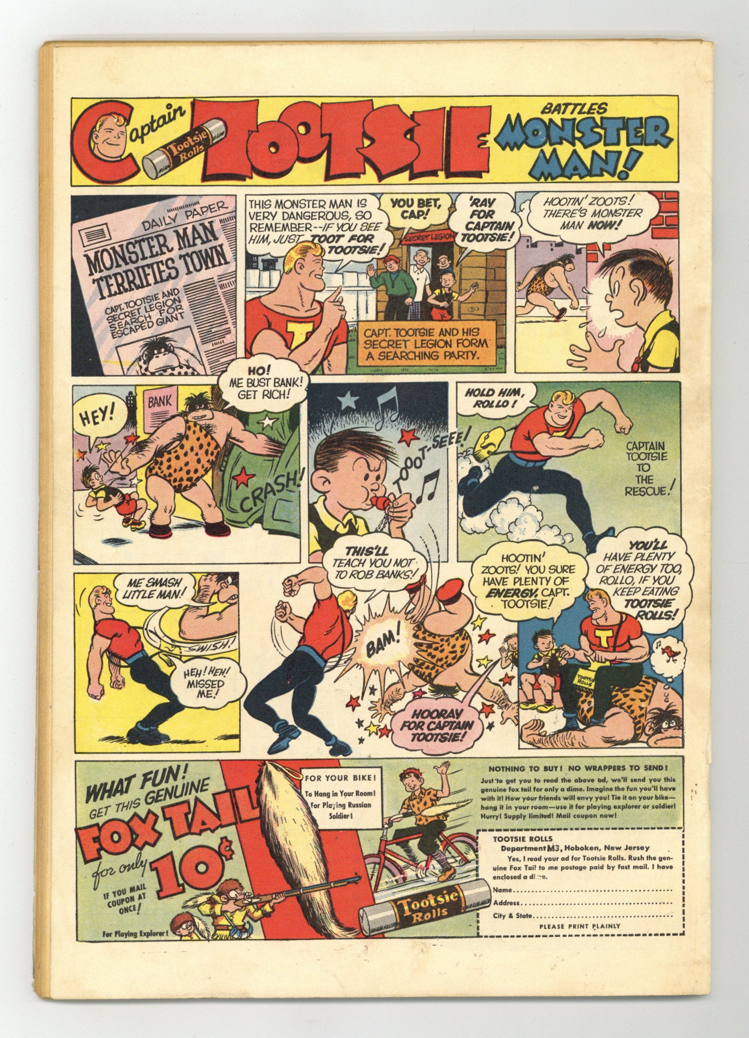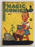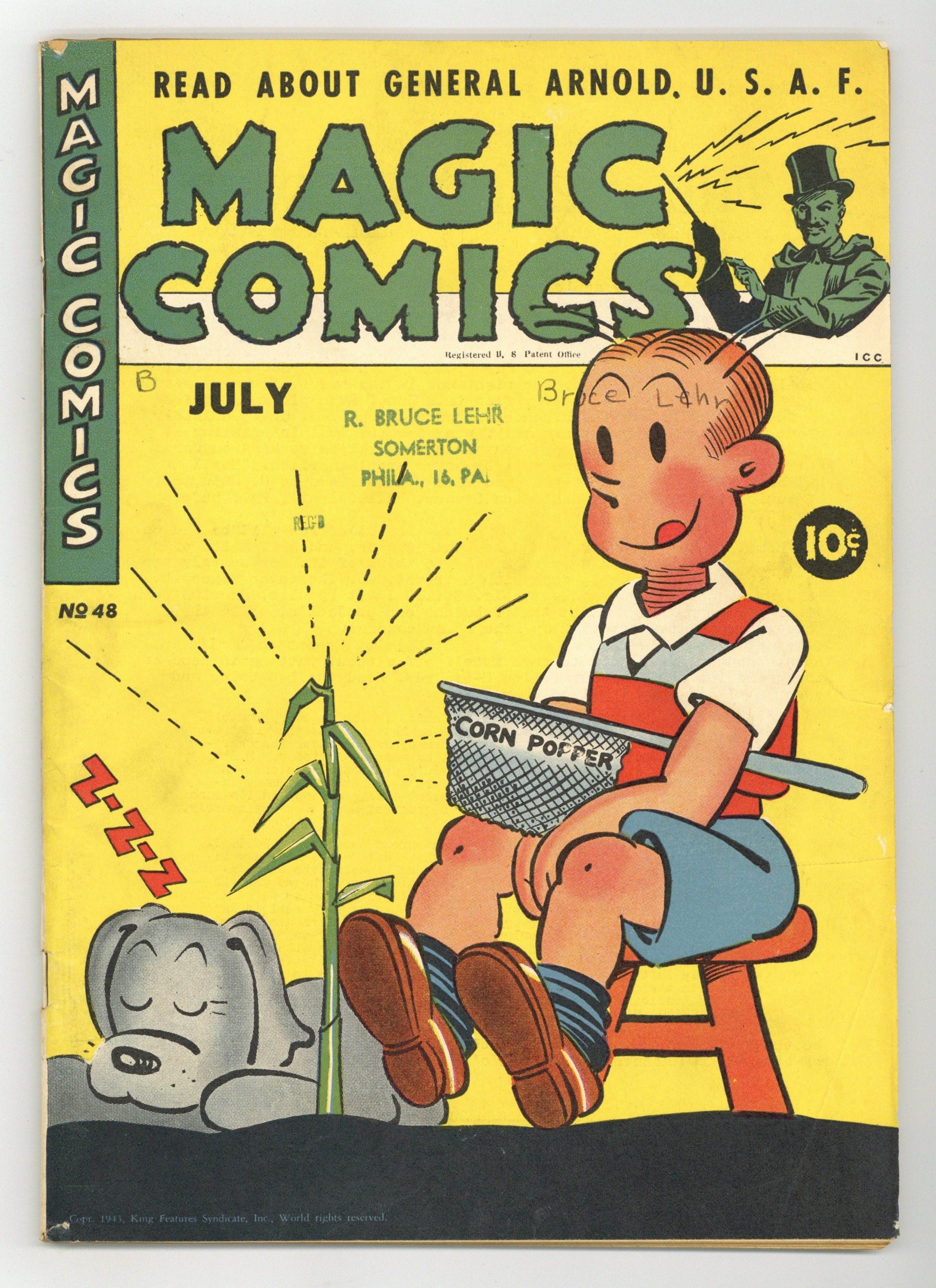 Published Jul 1943 by David McKay Publishing.$42.50Edited by Margery McKay (sometimes credited as G. Whiz). Stories and art by C.C. Beck, Lee Falk, Phil Davis, Feg Murray, Clayton Knight, H. H. Knerr, Fran Striker, Charles Flanders, Floyd Torbert, Robert Storm, Mel Graff, Carl Anderson, Edwina Dumm, Chic Young, Bob Dunn, Frank Miller, Joe Musial, Billy DeBeck, Jimmy Thompson, Eugene L. Pollack, Tom Sims, and Bela Zaboly. Lee Falk's adventurer Mandrake the Magician gets top billing in this anthology series featuring reprints of King Features Syndicate comic strips. The Lone Ranger and Tonto shoot the guns right out of the bad guys' hands. Back-cover Tootsie Roll ad, "Captain Tootsie Battles Monster Man," features art by Captain Marvel creator C.C. Beck. Mandrake the Magician; Seein' Stars; Jan and Aloysius; The Romance of Flying; Bunky; The Lone Ranger; Secret Agent X-9; Henry; Little Acorns; High Spots; Popeye; Barney Baxter; Blondie; Indian Lore; Tippie and Cap Stubbs; Dinglehoofer. 64 pages, Full Color. Cover price $0.10.