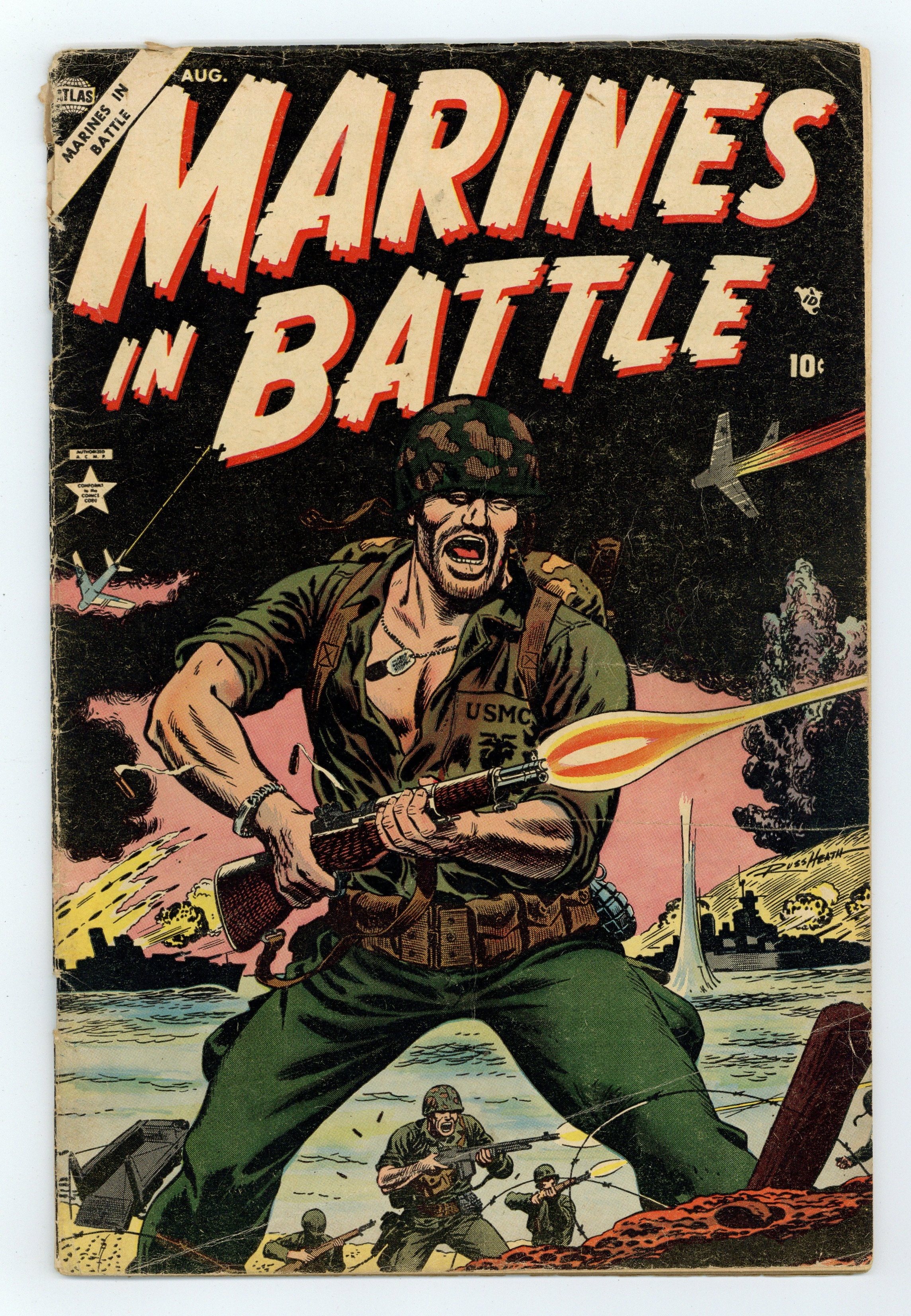 "Iwo Jima" (art by Gene Colan), "Belleau Wood" (art by Dick Ayers), "The History of the U.S. Marine Corps," and Iron Mike McGraw in an untitled story (art by Russ Heath). Two-page text story, "Marine Action." Heath cover. Cover price $0.10.