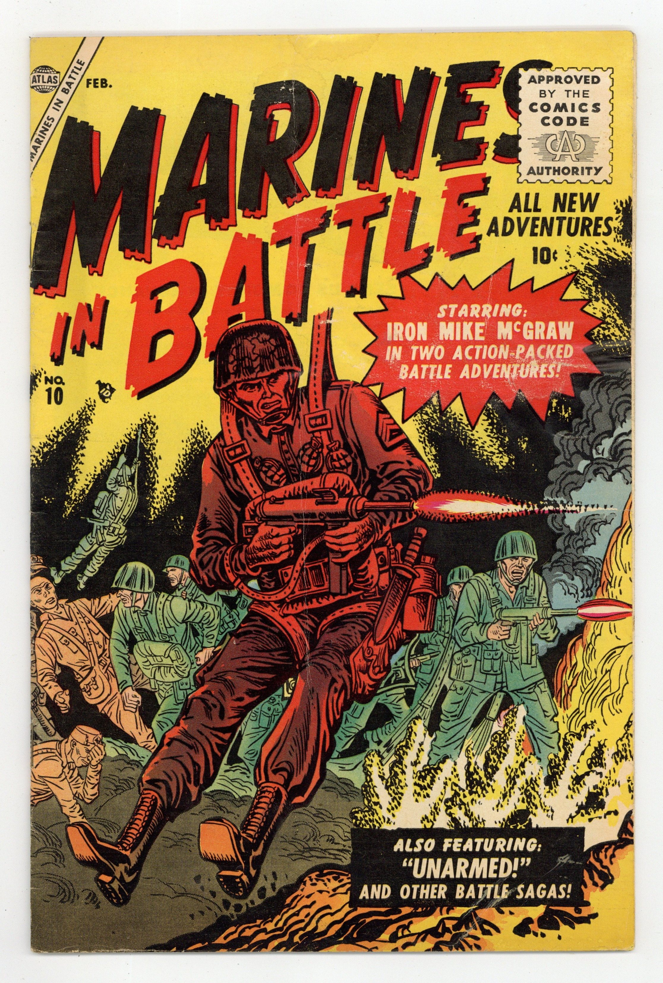 "Iron Mike" McGraw in "The Might of the Marines" (pencils by Forgione, inks by Jack Abel); "Unarmed!" (art by Gene Colan); "A Marine Named Mulligan" (art by Bob Powell?); the U.S. Marine Corps in "The Battle That Shouldn't Have Been Fought!" (art by Dick Ayers); and an untitled "Iron Mike" McGraw story (art by Forgione/Abel). Cover price $0.10.