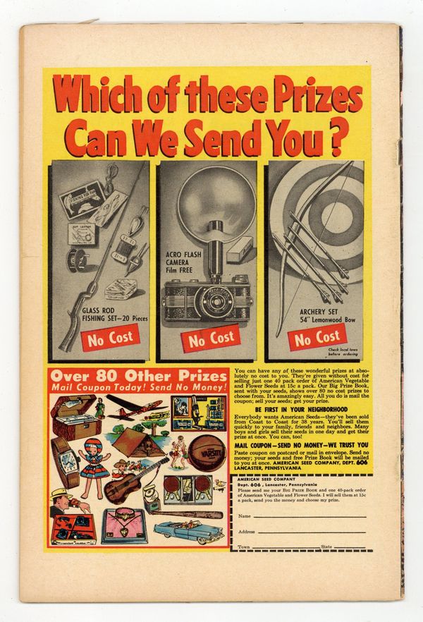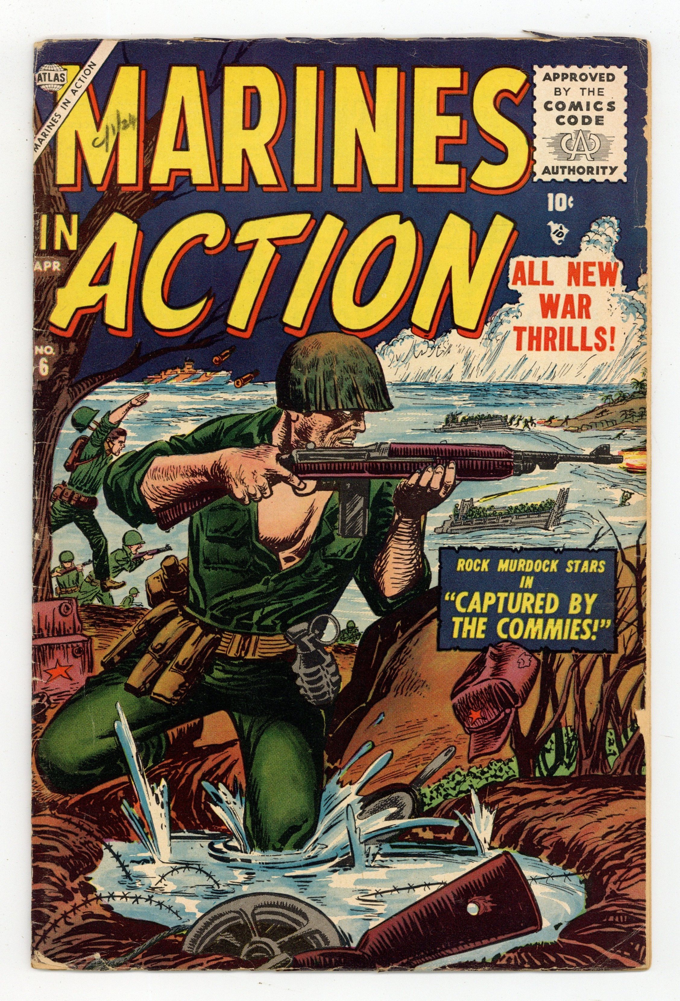 $32.00Rock Murdock in "Surprise Attack" and "Captured by the Commies," plus "Amphibious Assault" (art by Gene Colan), Boot-Camp Brady in "Made in the Marine Corps" (art by Dave Berg), "Mission in the Solomons" (art by Vic Carrabotta), and a two-page text story, "Lone Soldier." Cover price $0.10.