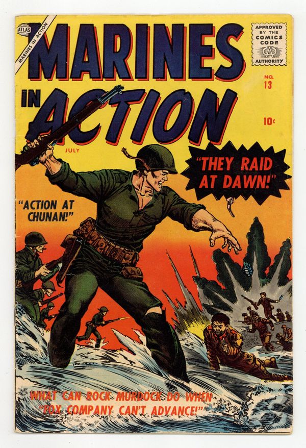 "They Raid at Dawn!" (art by Paul Reinman), "Action at Chunan!" (art by Joe Sinnott), Rock Murdock in "Fox Company Can't Advance," Boot-Camp Brady in "DMZ Marines," "Island Attack" (art by Bob Forgione), and a two-page text story, "Mine Expert." Cover price $0.10.