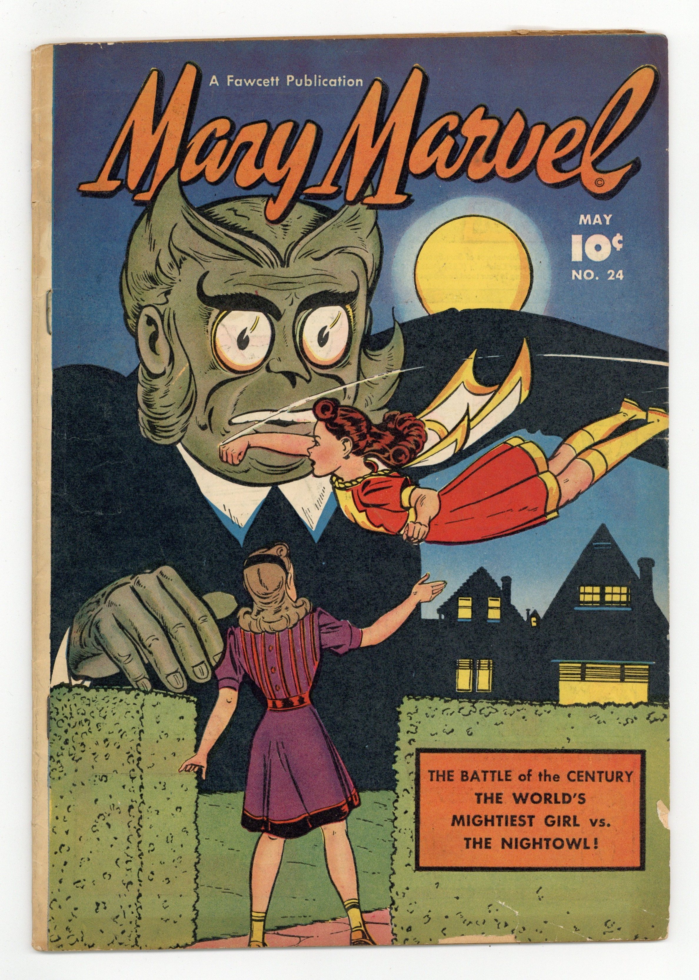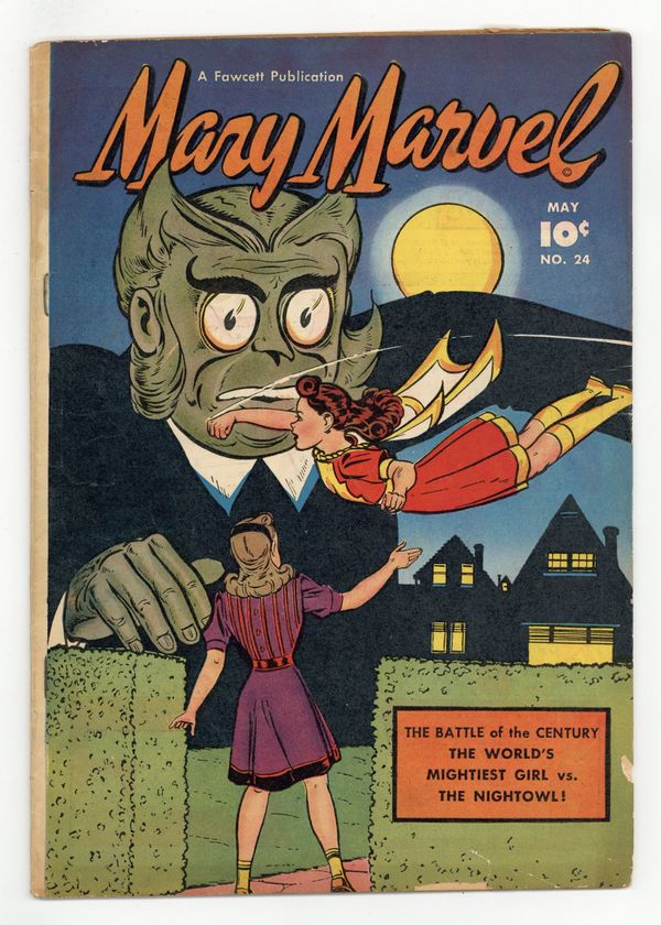$205.00Cover by Jack Binder. Stories by Otto Binder and Howard Boughner. Art by Jack Binder and Howard Boughner. Superhero action with Mary Marvel, long-lost sister of the original Captain Marvel, better known these days as Shazam. The mysterious cat burglar known as the Nightowl steals rare black diamonds, and Mary Marvel wants to catch him. Freshman Freddy joins the Volunteer Fire Department and comic hijinks ensue. Plus a plethora of comics-format ads, including private eye Sam Spade for Wildroot hair cream, and R. C. and Quickie for Royal Crown Cola. Mary Marvel Versus Nightowl: Evil in the Night; You've Got to Be Alert; Freshman Freddy: Volunteer Fireman; Fate's Choice; Fuzzy Bear; Dizzy Daisy; Beginner's Luck!! 36 pages, Full Color. Cover price $0.10.