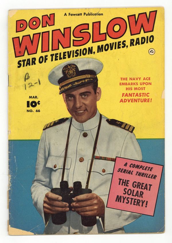 During the 1940s, military hero Don Winslow was the star of a comic strip, a movie serial and a popular radio show in addition to this Fawcett comic. In a three-part sci-fi story, Don and Red are assigned to test-fly the X-36, a plane designed to catch flying saucers. But the aliens capture the X-36 with Don and Red aboard, transporting it to the planet Venus. They must bargain with the Venusian leader, the Wizard of Oz-like Zimm, for Earth's survival. Tugboat Tucker; The Great Solar Mystery; Heroes of the Lawrence; Peril on Venus; Shipwreck and Seaweed: Daze Without End; Dangerous Return; Muscle Hedd. 32 pages, Full Color. Cover price $0.10.