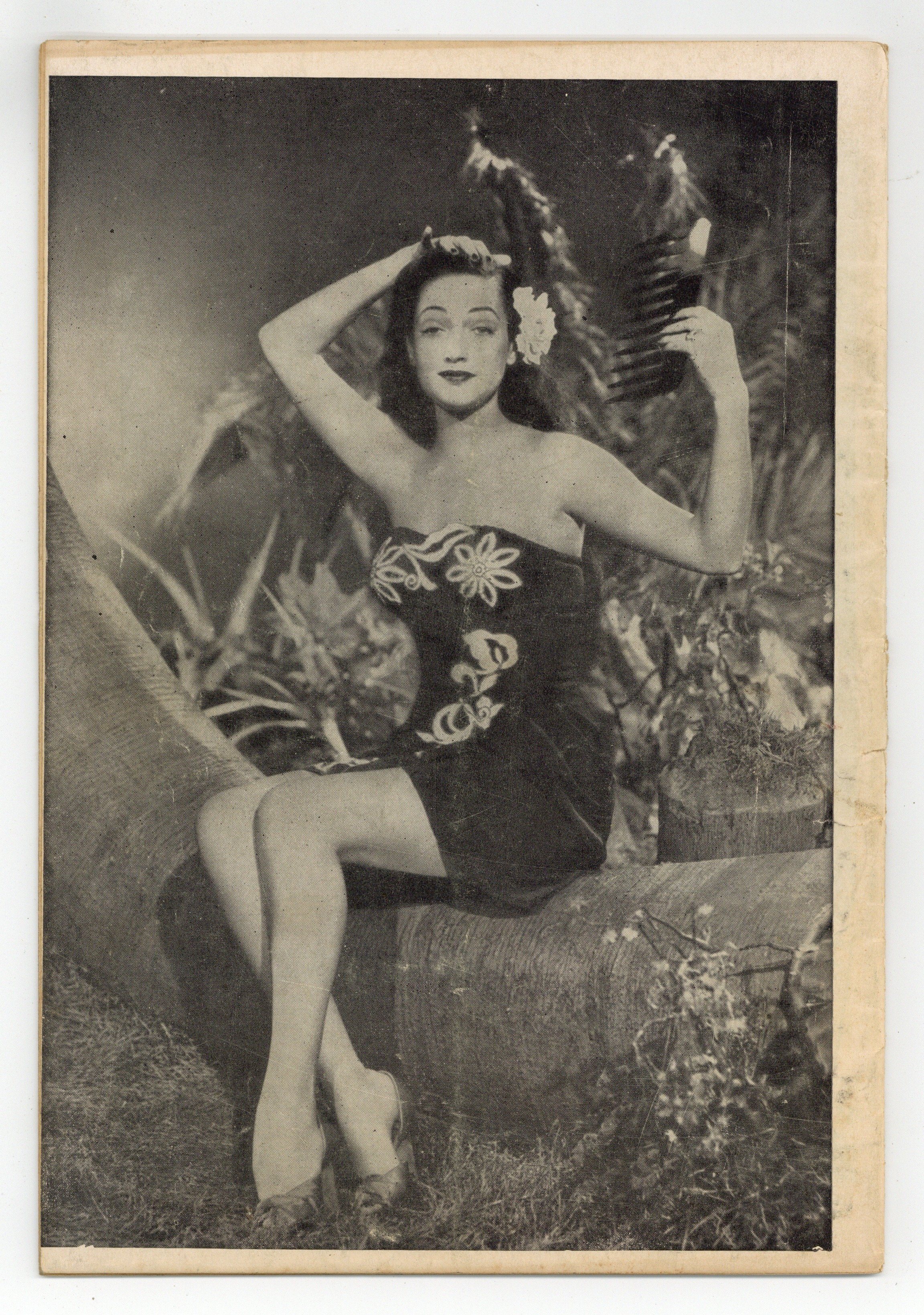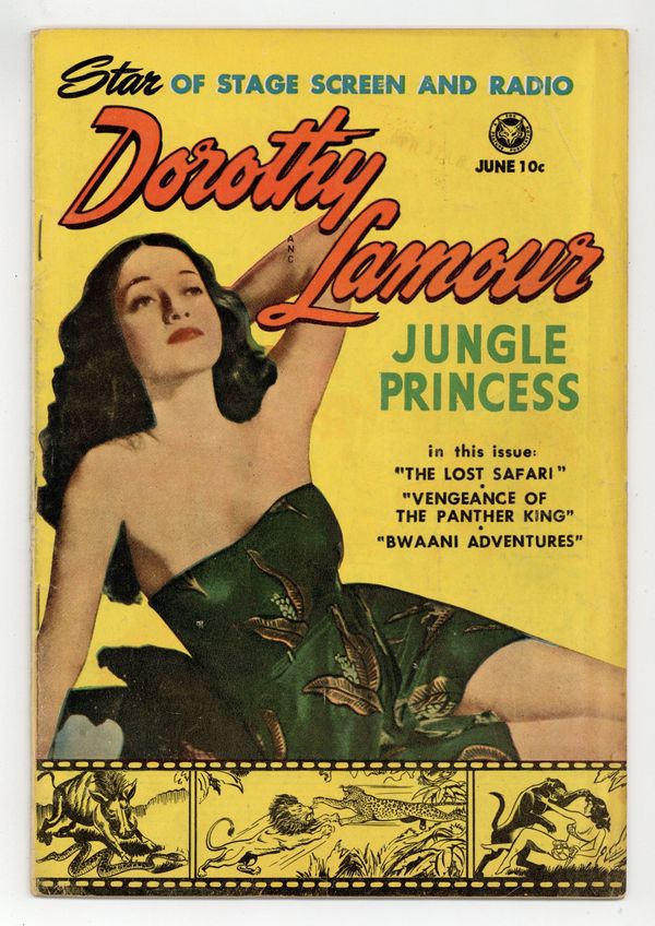 Published Jun 1950 by Fox Feature Syndicate.$70.00Art by Wally Wood and others. Celebrity comic featuring the female star of the Bob Hope-Bing Crosby "Road" movies, presented here as a Sheena-type warrior called Jungle Princess. Numbering continues from Jungle Lil (1950) #1. Jungle Princess seeks a rare moss that could be made into a much-needed medicine; Dorothy confronts a corrupt native chieftain; An African prince schemes to choose the next chief of the Bwaanis. Photo cover featuring a publicity still of the sarong-wearing movie star. Lost Safari; The Taming Of Priscilla; Vengeance of the Panther King; Elephant Stampede; Bwaani Adventures. In order of appearance: "Dorothy Lamour Jungle Princess, Lost Safari"; "Dorothy Lamour, Vengeance of the Panther King"; "Elephant Stampede"; and "Dorothy Lamour Jungle Princess, Bwaäni Adventures". "The Taming of Priscilla" text story. Indicia states "DOROTHY LAMOUR (formerly JUNGLE LIL)". 32 pages, Full Color. Cover price $0.10.