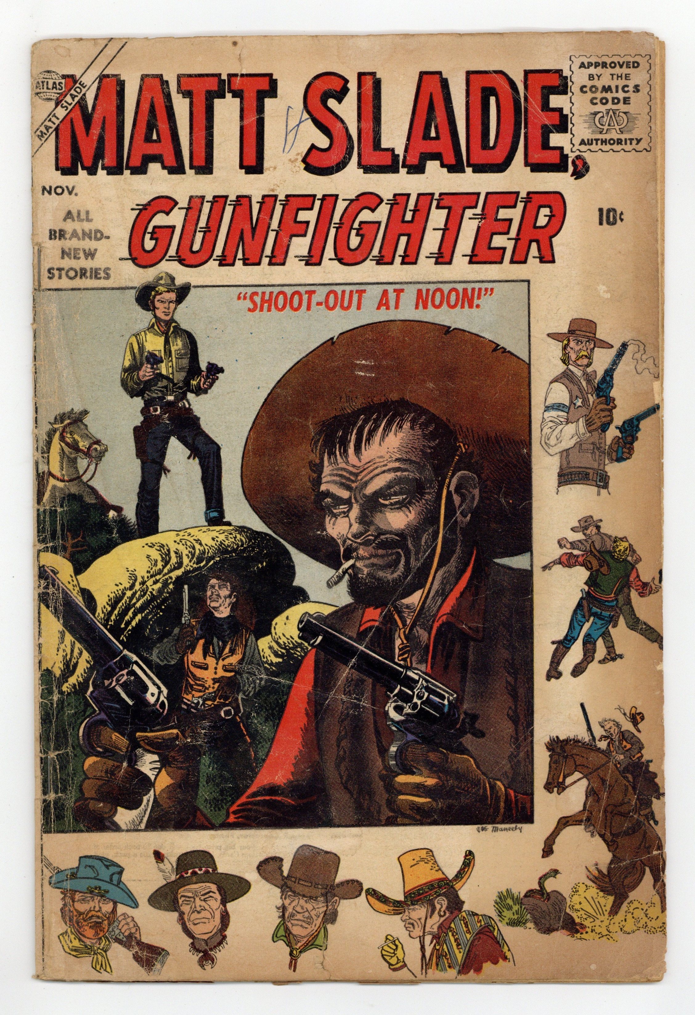 Final issue of the series (becomes Kid Slade Gunfighter with issue 5). Matt Slade stars in "Shoot-Out at Noon," "Gunsmoke Showdown," and two untitled stories. Back-up story, "Outlaw in Hiding" (script by Stan Lee, art by Ted Galindo). Joe Maneely cover. Cover price $0.10.