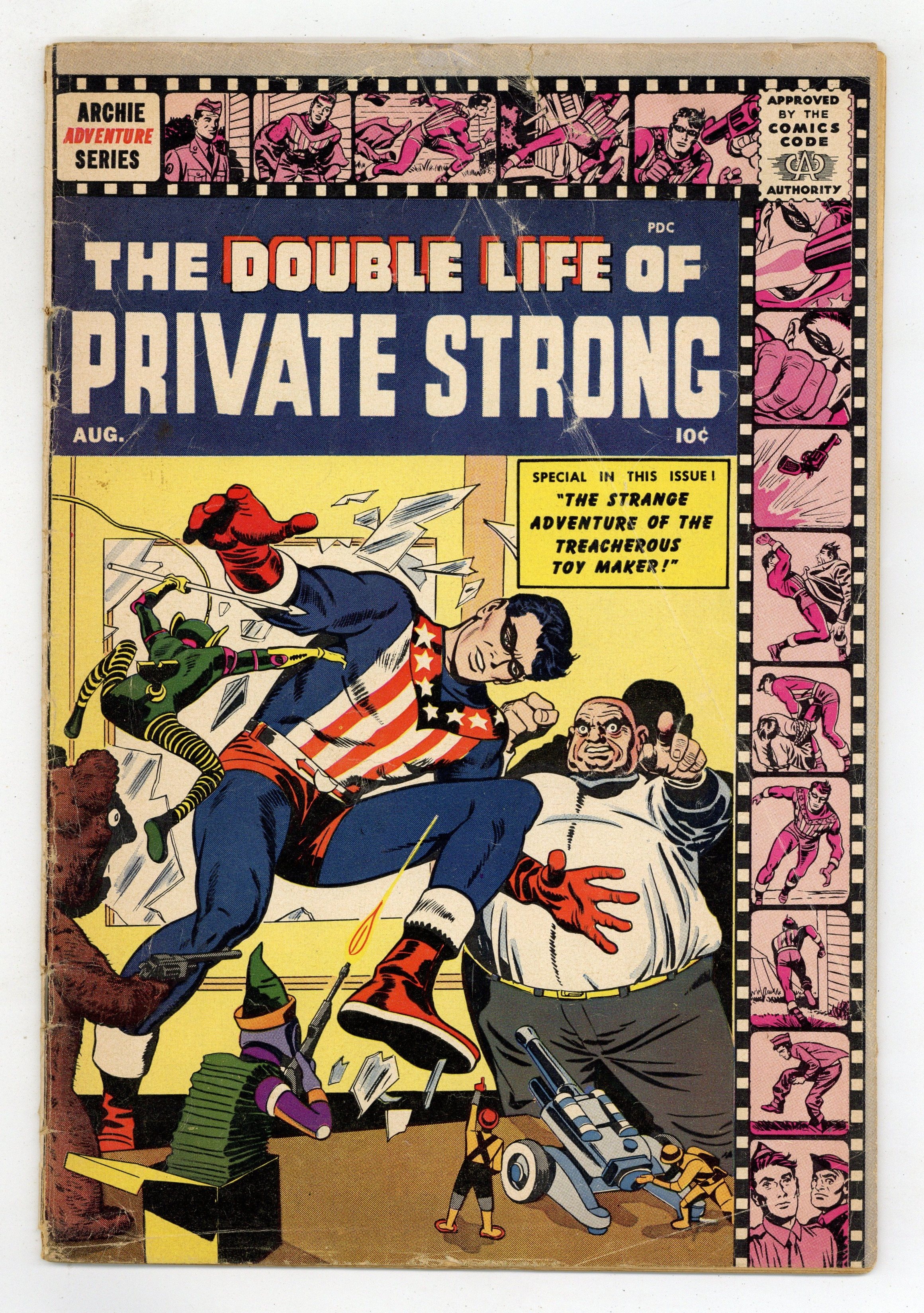 Final issue of the series. "Lovable Lou, the Toy Master" (pencils by Al Williamson and Larry Ivie, inks by Joe Simon), "Upsy Daisy" (pencils by George Tuska), "I Wish I Were the Shield," and "The Ultra-Sonic Spies" (art by Joe Simon/Jack Kirby). Two-page Fly story. Simon/Kirby cover. Cover price $0.10.