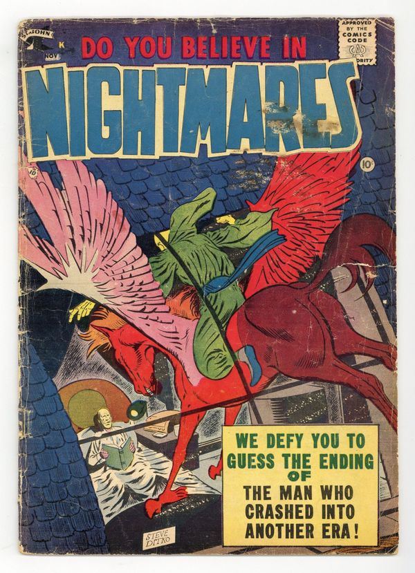 Cover by Steve Ditko. Stories and art by Steve Ditko and Dick Ayers. A short-lived attempt at horror under the new Comics Code from St. John. Most of the stories in this issue feature early art from Spider-Man co-creator Steve Ditko. After his wife dreams a terrible fate for him, a man tries his best to avoid it. An escaped convict's scientist brother gives him the power of flight. A hunter is captured by sentient bears, in a story with early art by comics legend Dick Ayers. Cover by Ditko. Nightmare; The Somnambulist; The Strange Silence; The Champ; You Can Make Me Fly; The Man Who Crashed into Another Era!; I Am Being Followed. 32 pages, Full Color. Cover price $0.10.