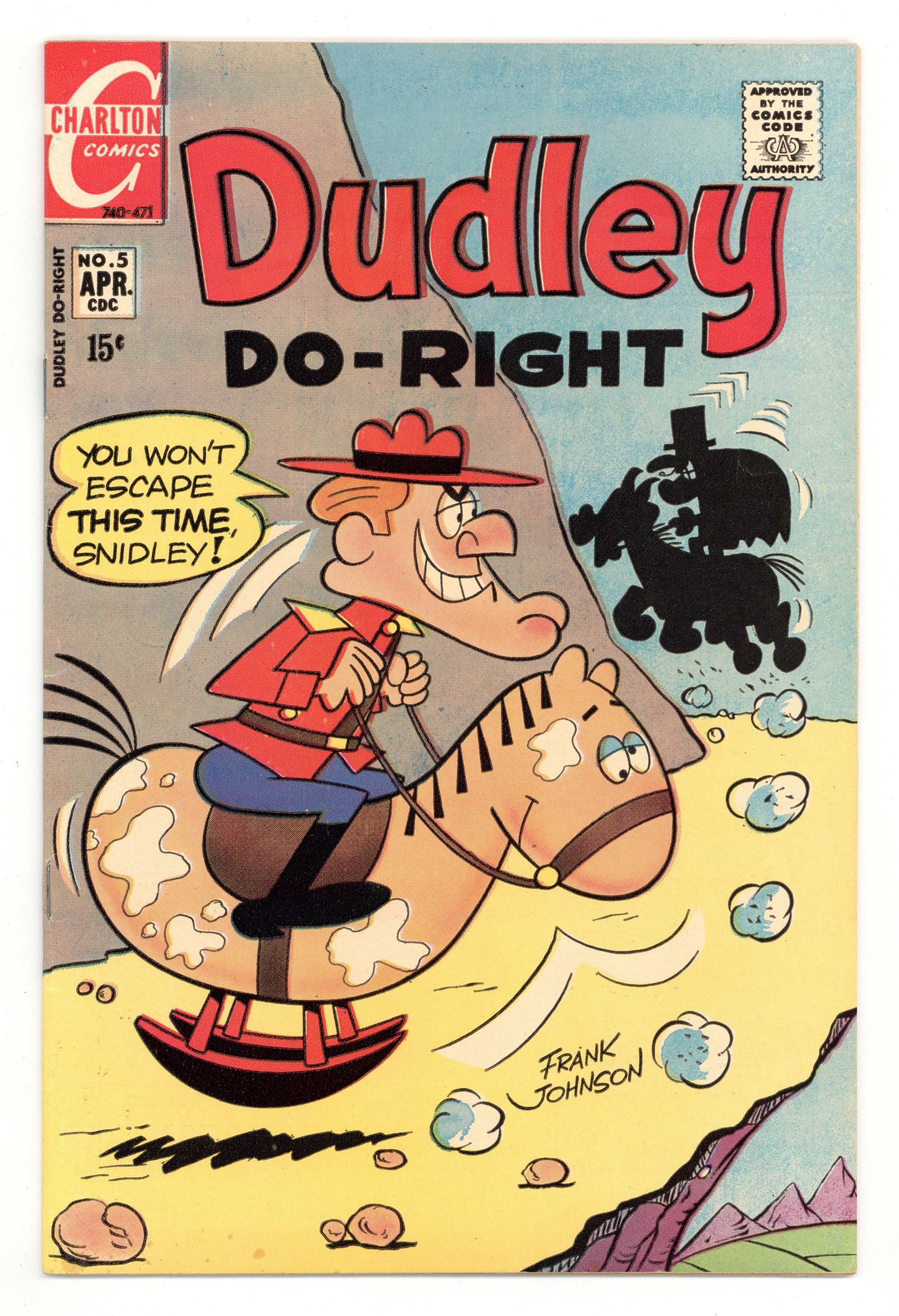 Published Apr 1971 by Charlton Comics Group.$22.00Cover by Frank Johnson. My Friend Benny!; A new man, Benedict Arnold, joins the Mounties and cases go unsolved. Kids! Color Snidely Off Key activity page. $10,000 Annual Sled-Pullin' Contest; Snidely wins the dog sled-pullin' contest every year with his elephant Spot; Can Dudley win with his "dog" Wolf? Faithful Readers, Color Dudley's Faithful Dog Faithful! activity page. Git Outa My Lake!: Beavers build a dam. Based on the classic cartoon series. 36 pages, full color. $0.15. Cover price $0.15.