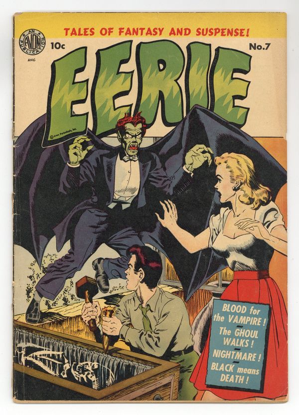 Cover by Wally Wood and Joe Orlando. Edited by Sol Cohen. Art by Joe Kubert, Norman Nodel, George Roussos, Harry Lazarus, and Vince Alascia. Tales of horror from the era just before the Comics Code was introduced. A couple vacationing in the Alps learns the truth about an old family legend about vampires; A writers new play causes the devil to appear; A police detective discovers the horrifying truth about the murder spree hes been investigating far too closely. Blood for the Vampire; Haunted Honeymoon; Hounds from Hell; The Ghostly Diners; Black Means Death!; The Nightmare; The Ghoul Walks! 36 pages, Full Color. Cover price $0.10.