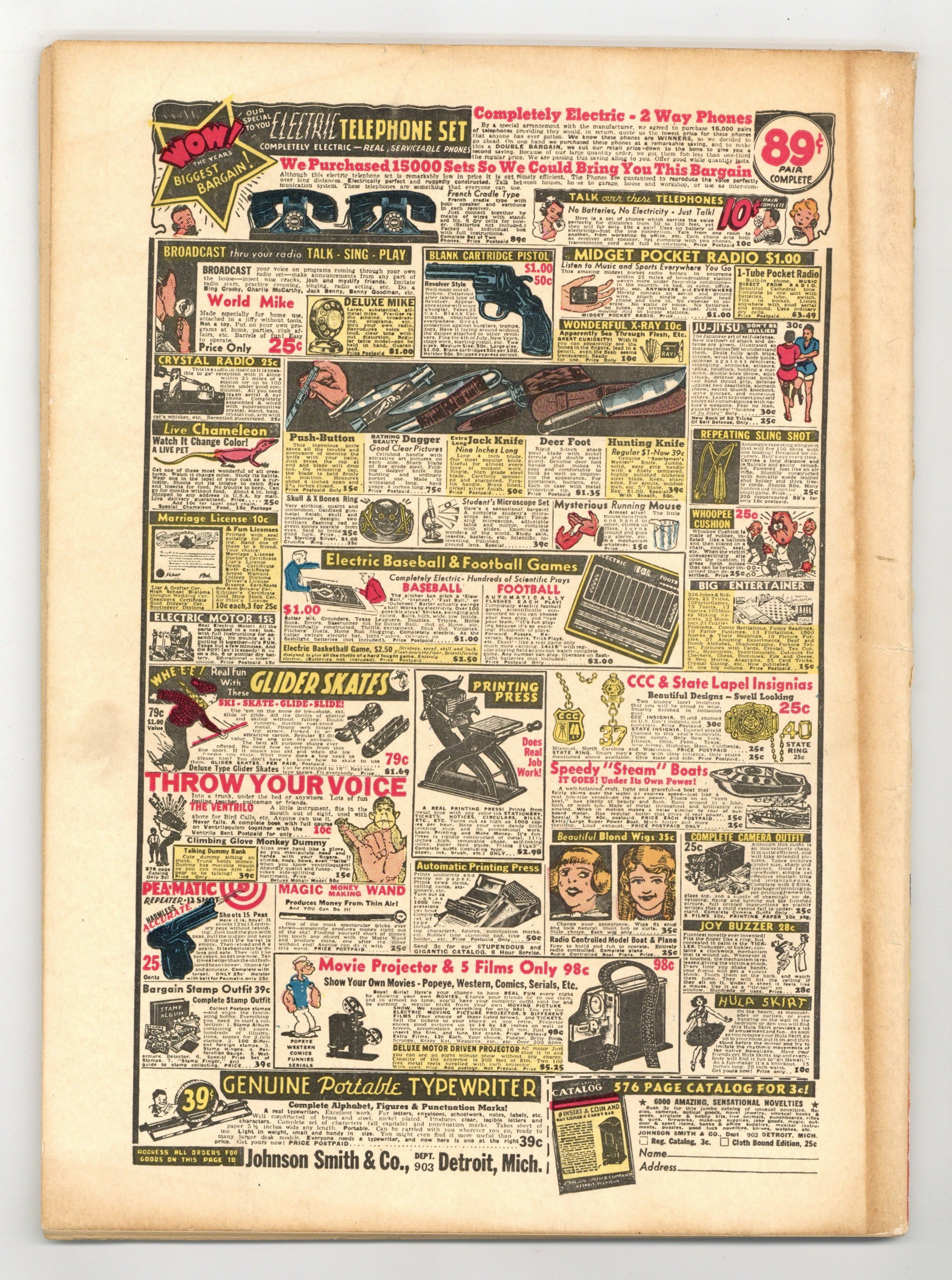 Stories and art by Charlie Plumb and Bill Conselman. United's anthology series presented a different comic-strip character in every issue. This issue focuses on Depression-era rags-to-riches hero Ella Cinders. Ella takes out an injury policy on her brother Blackie, but she's the one who's accident-prone. Ella and Blackie take a cruise. In the "topper" strip, Chris Crusty gets lost in a funhouse maze and finally finds a guide, who's been lost even longer. Ella Cinders; Chris Crusty. 64 pages, Full Color. Cover price $0.10.