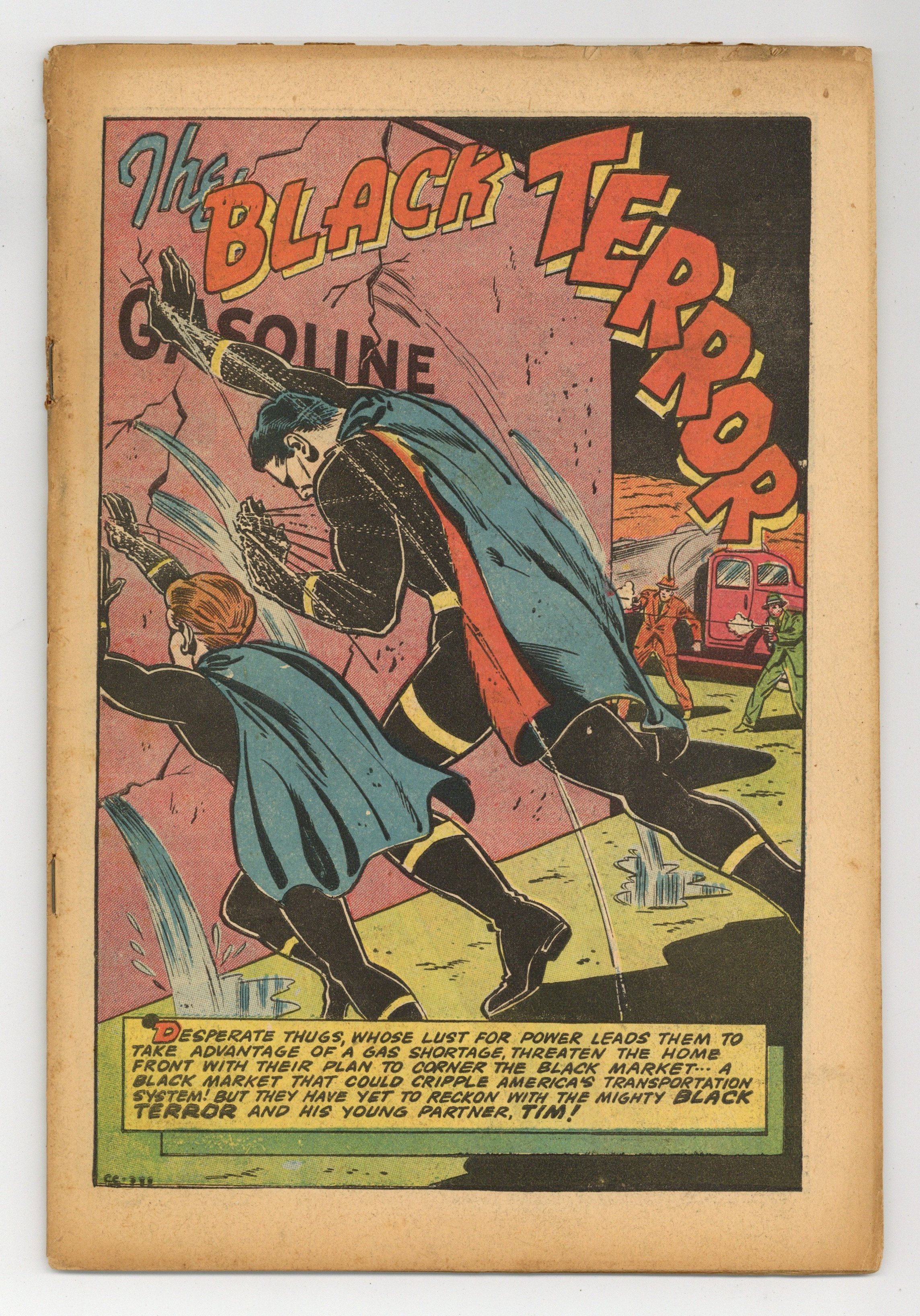 Cover by Alex Schomburg. Stories by unknown. Art by Al Camy, Ken Battefield and unknown. In this issue: untitled The Black Terror story; Kara, the Jungle Princess in "Inescapable Disaster" (vs. Targala) with art by Al Camy; untitled American Eagle story (vs. The Cat); and untitled The Scarab story with pencils by Ken Battefield. Plus: 1-page text stories "The Silver Bracelet," "Rescue at Sea" (by Charles S. Strong; credited as Charles Stoddard) and "Sheriff's Prisoner" (by Sam Brant - a house name); untitled Boitram half-pager; and 1-pager "Dangerous Roomers"! 52 pages, full color. Cover price $0.10.