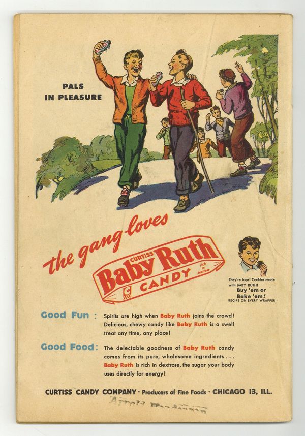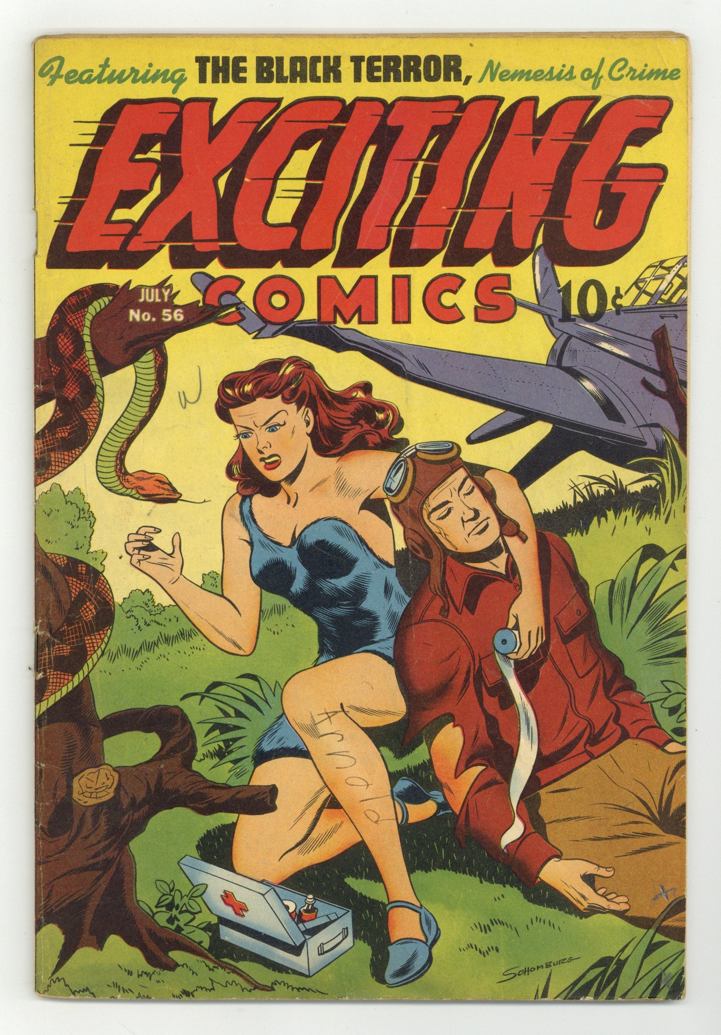 Published Jul 1947 by Nedor/Better Publications.$264.00Cover by Alex Schomburg. Stories by Al Hartley and unknown. Art by Al Hartley, Ralph Mayo, Edmond Good, Graham Ingels, Mort Meskin and unknown. In this issue: "Exciting Headliners" table of contents page with art by Graham Ingels; The Black Terror in "The Mastermind of the Moon"; Roger Dodger in "Nice Mice" by Al Hartley; Judy of the Jungle in "The Lords of Memnon" with art by Ralph Mayo (story continues in #58); Strut Simmons in "Death Cargo" with art by Edmond Good; and The Crime Crushers in "The Case of the Reckless Necklace" with most of the art by Mort Meskin (and some of the inks possibly by Frank Frazetta). Plus: 1-page text story "Rock Collector" (by Charles S. Strong; credited as Charles Stoddard); untitled You Just Can't Win! 1-pager (by Jules Steiner); 2-page text story "Rhythm of the Jungle" (by Donald Bayne Hobart); and untitled Little Legends 1-pager (by Jules Steiner). 48 pages, full color. Cover price $0.10.