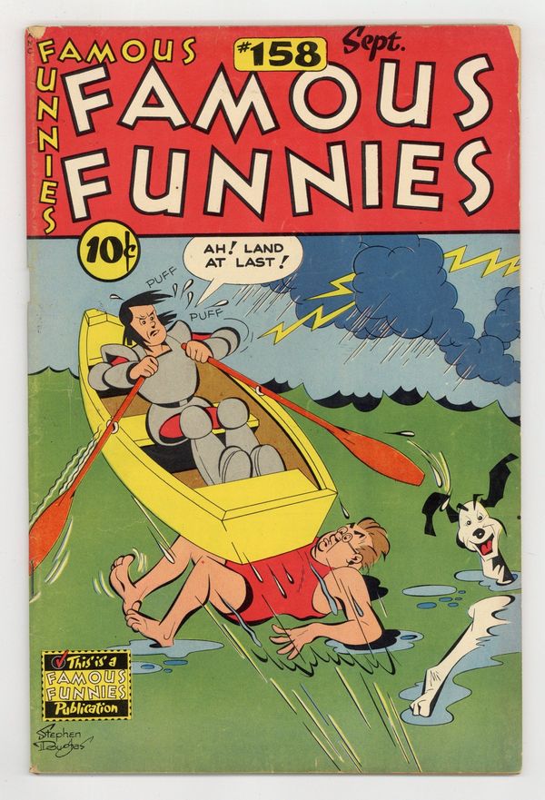 Tags: Comic Strip ReprintsPublished Sep 1947 by Famous Funnies.$27.00Contains comic strip reprints, activity pages, and a text story. In order of appearance: "Buck Rogers" by Philip Francis Nowlan and Rick Yager (as Dick Calkins); "Invisible Scarlet O'Neil" by Russell Stamm; "Steve Roper and Wahoo" by Allen Saunders and Elmer Woggon; "Napoleon" by Clifford McBride; "Dickie Dare" by Milton Caniff; "Scorchy Smith" by Noel Sickles; and "Oaky Doaks" by Ralph Briggs Fuller. "Timber Trap" text story. Activity pages by A. W. Nugent. 52 pages. Full color. Cover price $0.10.