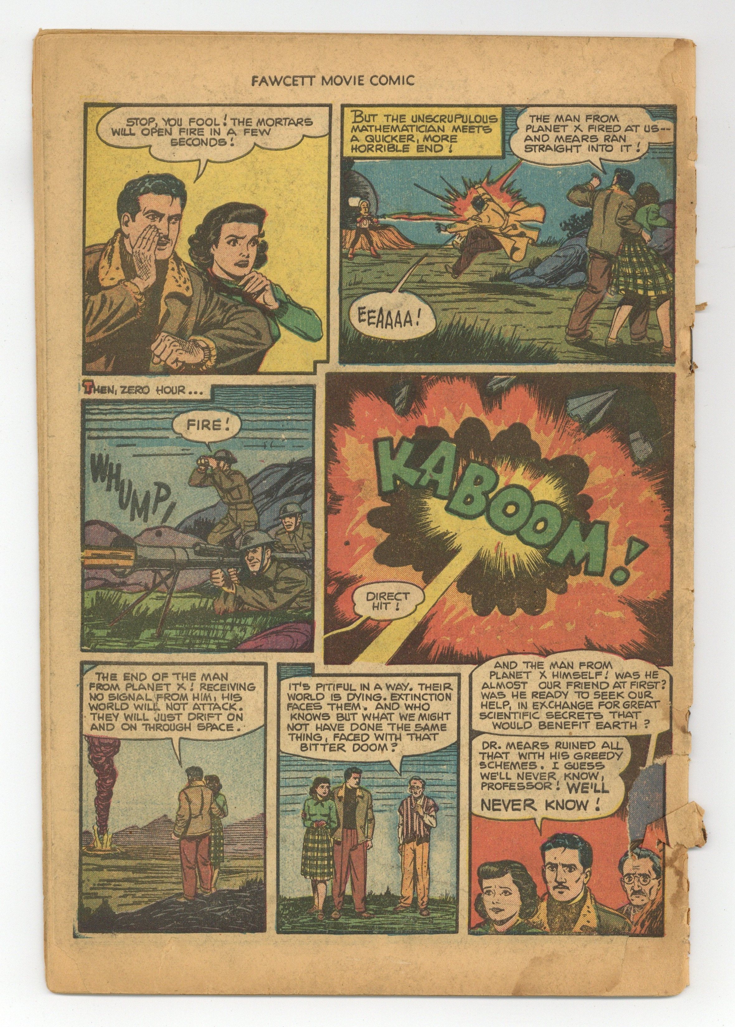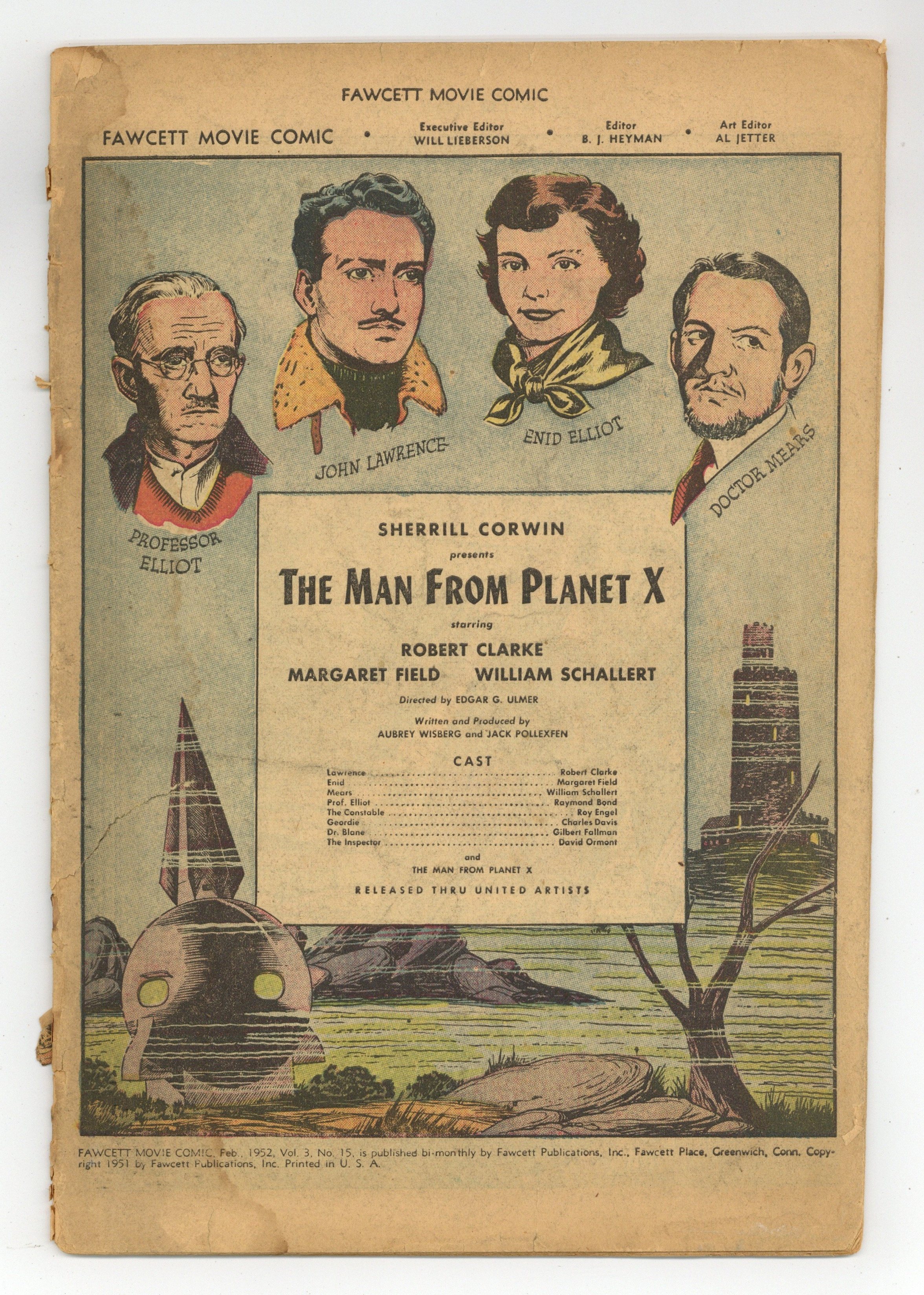 Story by Otto Binder, from the screenplay by Aubrey Wisberg and Jack Pollexfen. Art by Kurt Schaffenberger. Fawcett presents adaptations of popular movies of the 1950s in comics form. This issue is based on The Man from Planet X, a 1951 science fiction horror film directed by Edgar G. Ulmer. A scientist studying a "rogue planet" on a remote Scottish moor witnesses the arrival of a visitor from Planet X. He and his cohorts and daughter struggle to understand what the alien wants and why it is on Earth. Plus photo stills from the film. 32 pages, Full Color. Cover price $0.10.