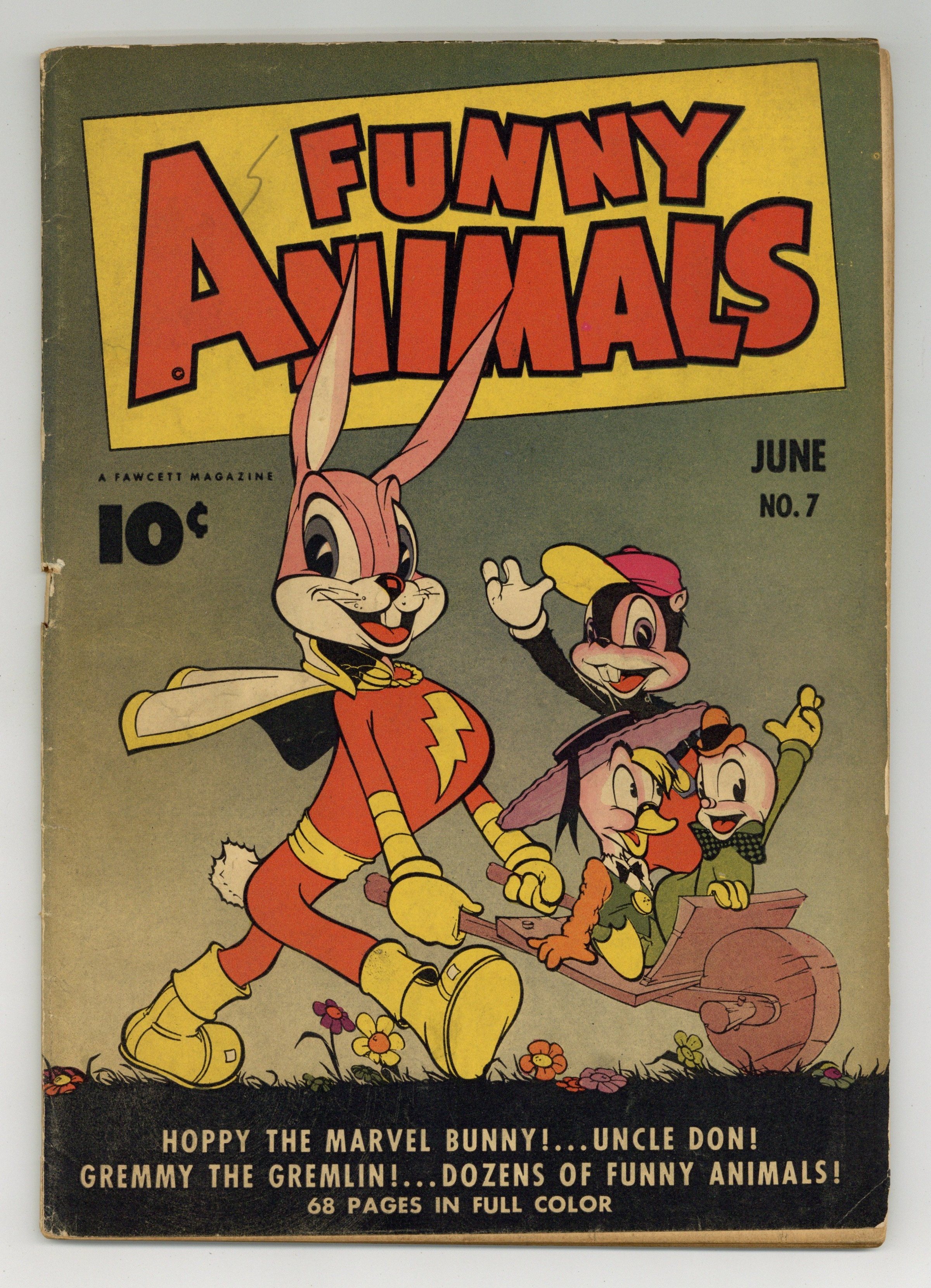 Stories and art by Chad Grothkopf and Bill Brady. Funny-animal comics from Fawcett, featuring Hoppy the Marvel Bunny, who has the same powers and power-word as his hero (Shazam!). Hoppy battles a giant who has taken Millie prisoner. Monkey detective Sherlock Monk seeks a stolen camera prototype that can acquire anything it takes a picture of. Sheriff Oscar is hypnotized into releasing the Rattler from the Cactus County Jail, and Billy the Kid must recapture him. Plus a Reddy Dough story promoting War Bonds and Stamps, fundraising efforts for WWII. Hoppy the Marvel Bunny; Benny Beaver and Fuzzy Bear; Gremmy the Gremlin; Pencil Pranks; Sherlock the Monk and Chuck; Puzzle Prank-Sherlock's Mysterious Maze!; Uncle Don: "Anticipators" another Willipus-Wallipus, Jr. story!; Reddy Dough; Billy the Kid and Oscar; Willie the Worm and Sammy. 64 pages, Full Color. Cover price $0.10.