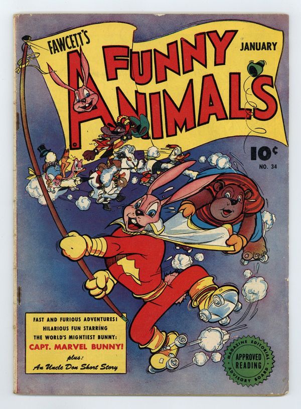 Stories and art by Chad Grothkopf and Bill Brady. Funny-animal comics from Fawcett, featuring Hoppy the Marvel Bunny, who has the same powers and power-word as his hero (Shazam!). Hoppy mounts a desperate plan after bank robbers get the drop on him. Billy the Kid meets The Conceited Highwayman, who considers himself the handsomest, strongest and smartest hombre in the West. Hoppy goes on a quiz show. Hoppy the Marvel Bunny: Desert Danger; Billy the Kid and Oscar: Horse Feathers; Color-Me-Up; Sherlock the Monk and Chuck Meet a Slippery Customer; Willipus Wallipus: Sick Fibber; Billy the Kid and Oscar: The Conceited Highwayman; Willie the Worm and Sammy: The Last Straw; Benny Beaver and Fuzzy Bear: Let's Talk Business; Hoppy the Marvel Bunny: The Quiz Show. 32 pages, Full Color. Cover price $0.10.