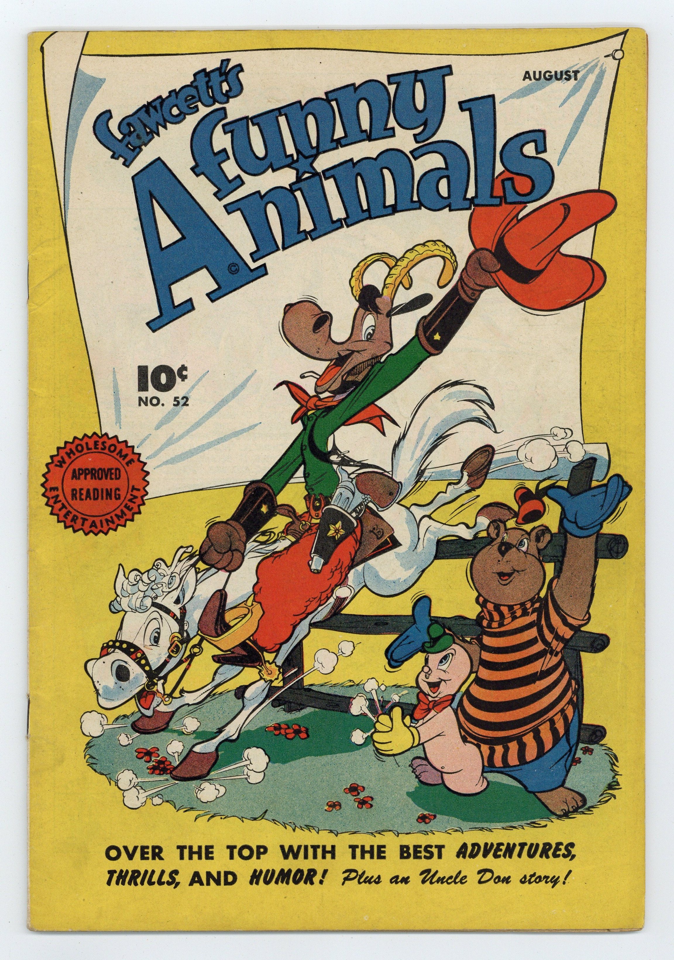 $21.00Funny-animal comics from Fawcett, featuring Hoppy the Marvel Bunny, who has the same powers and power-word as his hero (Shazam!). Billy the Kid tries to keep outlaw Trigger Boley from crossing the border. Benny Beaver decides to take some time off to go to the dance, but finds himself working twice as hard as he normally does. When White Beauty, the famous racehorse, disappears, could Foxy the jockey be involved - and where did that black horse come from? Plus a delightful vintage ad for Schwinn bicycles featuring movie cowboy Roy Rogers and his horse Trigger: "Next to riding you, Trigger, there's nothing like riding a Schwinn!" Billy the Kid and Oscar: On the Border of Trouble; Battling Bantam: The Private Tutor; Willipus Wallipus: Bad Medicine; Benny Beaver: Double Trouble; Willie the Worm: Shades of the Night/ Willie the Worm Cries Uncle/ Sounds Off; Sherlock the Monk and Chuck: Horse Sense; Benny Beaver and Fuzzy Bear: Less Strain on the Eyes. 32 pages, Full Color. Cover price $0.10.
