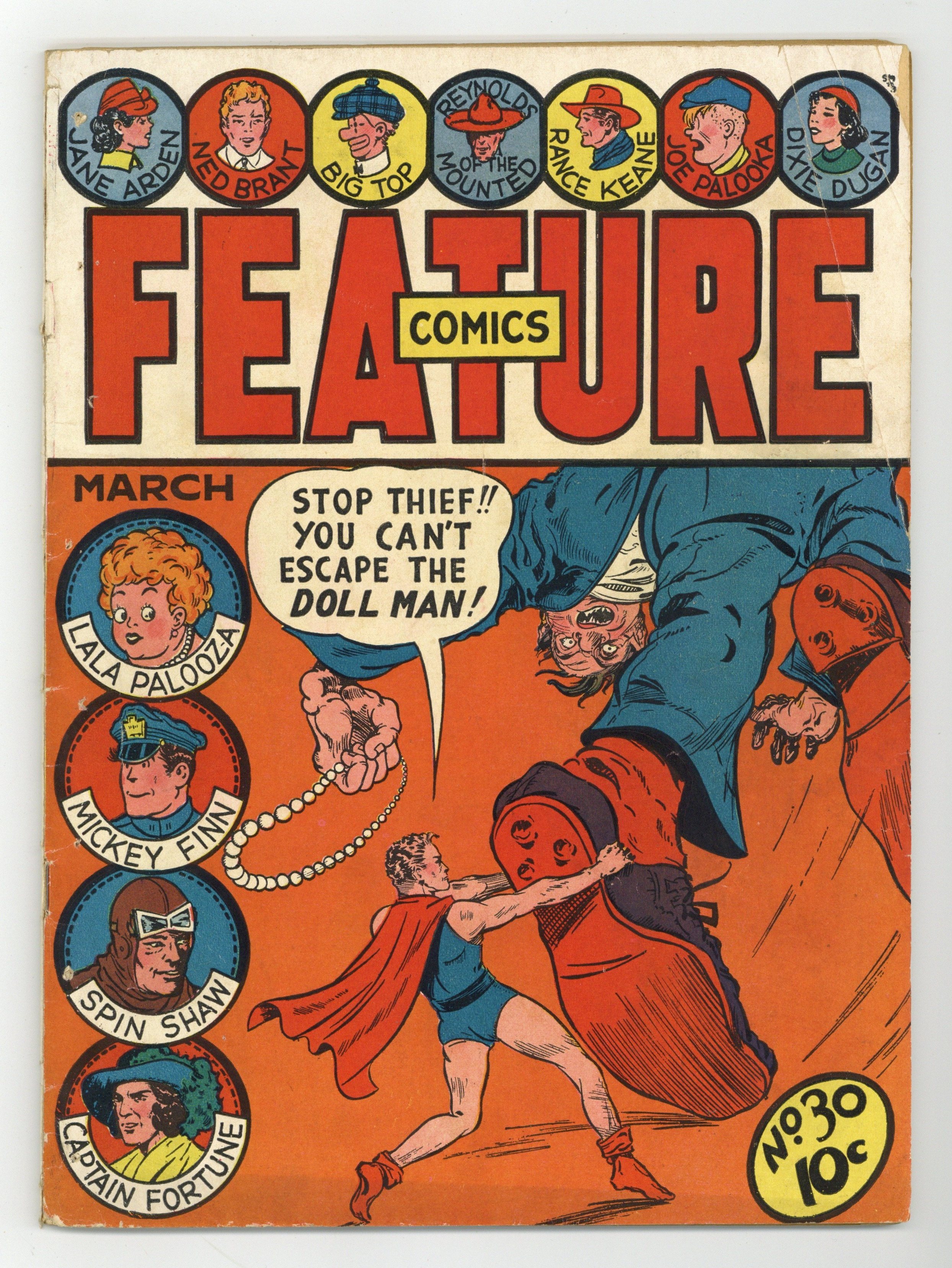 Cover art by Lou Fine. "The FBI Agent Killing," script and art by George Brenner; The Clock (Brian O'Brien) battles Carl Adolf Voss. Untitled soap opera-type story starring Jane Arden and Lena Pry, script by Monte Barrett, art by Russell E. Ross. "The Phoney Gold Shipment," script and art by Art Pinajian; Reynolds of the Mounted vs. Lane and Jeff Dixon. 2 pages of Rube Goldberg's Side Show. "Collision at Sea" starring Spin Shaw, Captain "Poison" Atkins, and Ann Atkins, script and art by Bob Powell. Untitled Ned Brant story, script by Bob Zuppke, art by R. W. Depew. "The Fate of the DRAGON" starring Captain Fortune, script and art by Vernon Henkel. "The Bomber Engine Robberies," script by Will Eisner (as William Erwin Maxwell), pencils by Will Eisner and Lou Fine, inks by Lou Fine; Doll Man (Darrel Dane) vs. The Nazis. "The Bridge Blasters," script by William A. Smith, art by William A. Smith (as Will Arthur); Rance Keane vs. Seth Cheatham. Untitled Joe Palooka story, script and art by Ham Fisher. "The Dr. Croft Ruby Mystery: Part 1," script and art by Alfred Andriola; Detective-mystery story with Charlie Chan. Untitled Mickey Finn and Nippie story, script and art by Lank Leonard. 68 pgs., full color. Cover price $0.10.