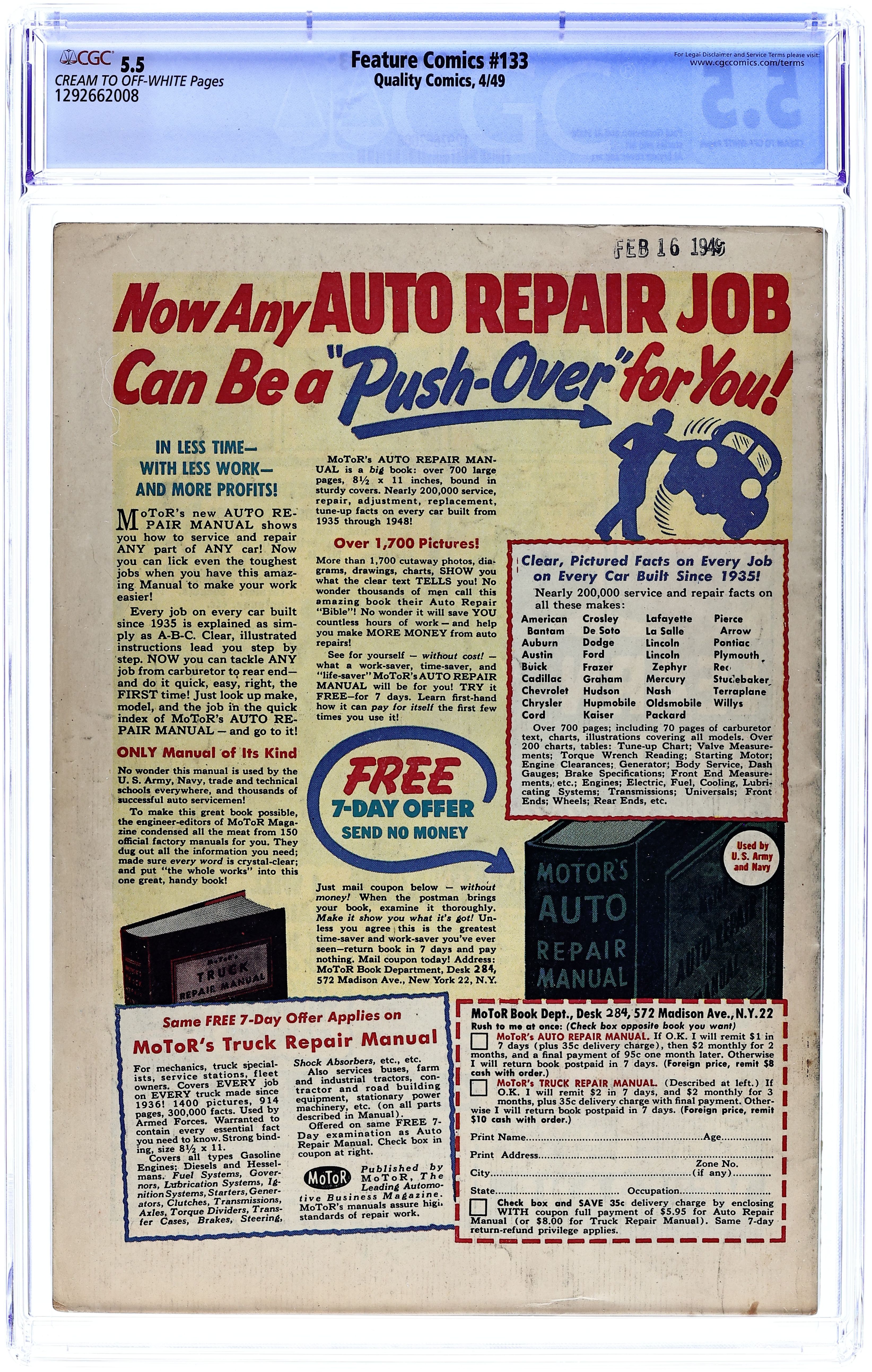 Cover pencils by Bill Ward. "Darrel Dane's Double," pencils by Bill Ward; Doll Man rescues a man who could be his double from committing suicide. "A Helping Hand For Lolly," pencils by Alice Kirkpatrick; A new girl has a date with Swing Sisson. "The Treasure of Captain Kidd" starring Blimpy and Captain Jones, script and art by Al Stahl. "Black Beard the Bandit," script and art by Paul Gustavson; Rusty Ryan vs. Black Bear. 36 pgs., full color. Cover price $0.10.