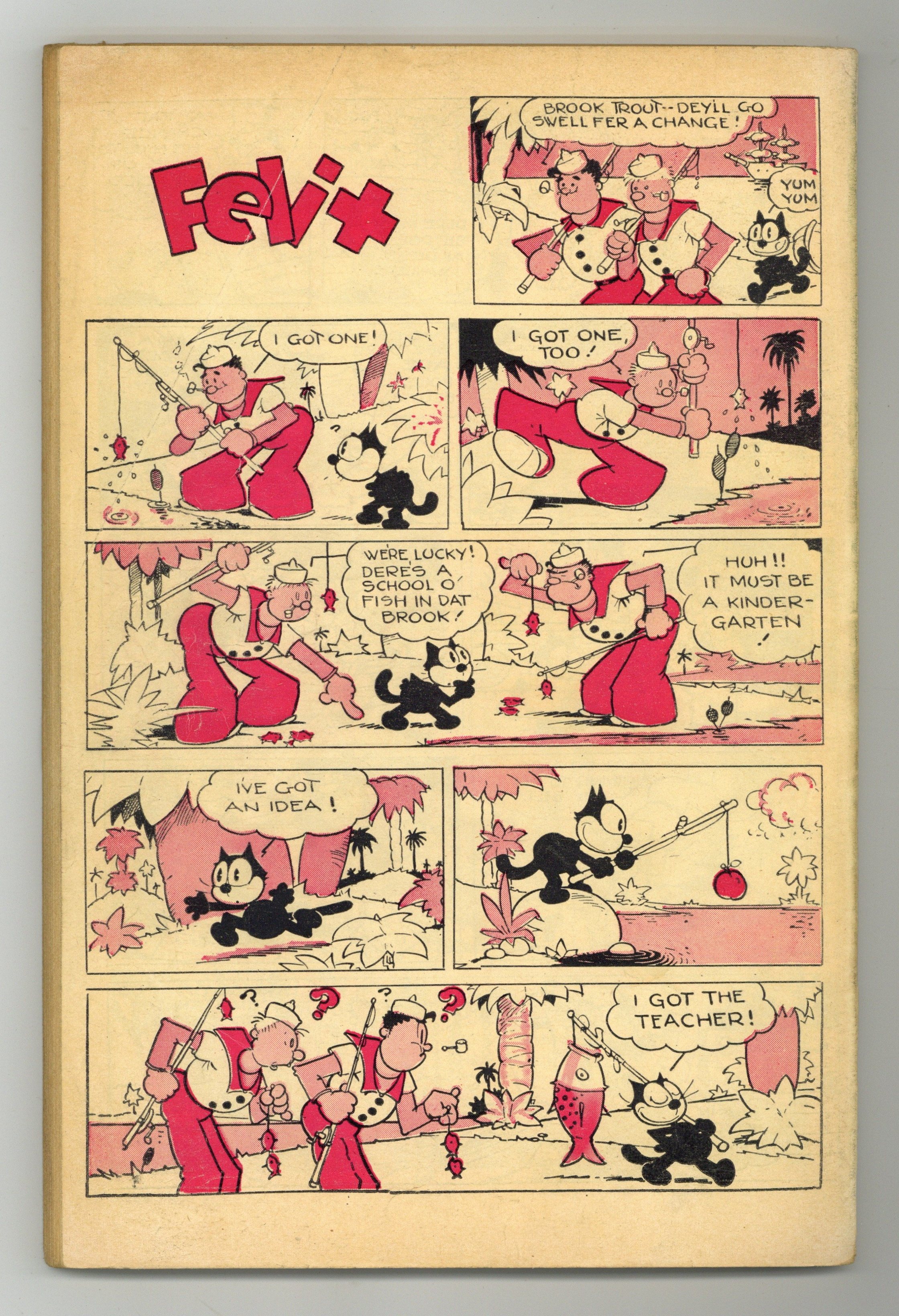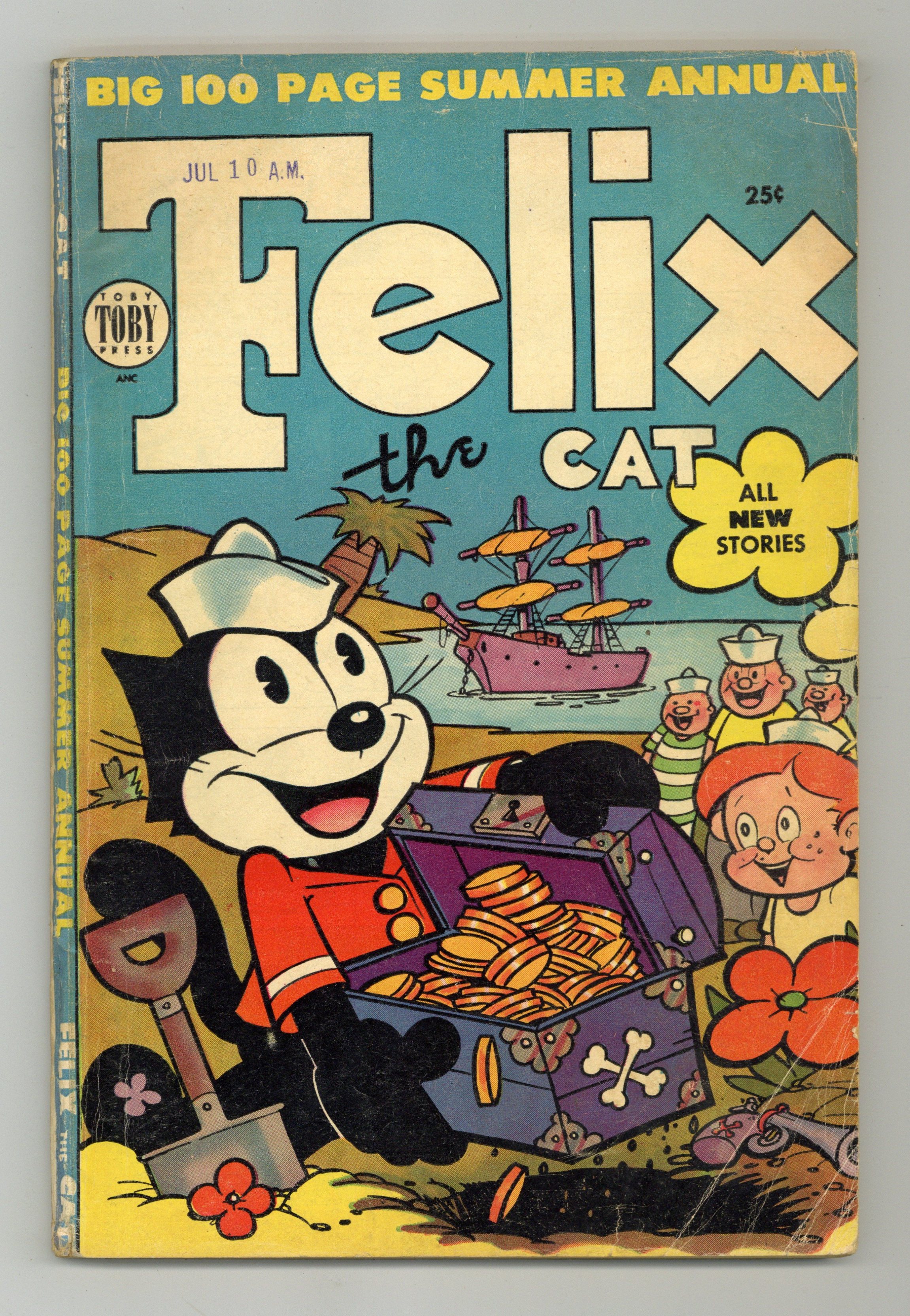 Cover by Otto Messmer. Stories and art by Otto Messmer. A collection of the Felix the Cat comic strip, reformatted to fit comic-book pages. Felix and a sailor search for treasure on a desert island. Cold Fever; The Barter System; Pointed Facts; Tropic Topics. Although it was not numbered itself, this issue was followed by Felix the Cat Winter Annual (1954) #2. Squarebound, 100 pages, Full Color. Cover price $0.25.