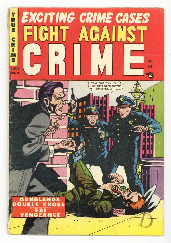 Cover by Ed Goldfarb and Bob Baer. Stories and art by Ed Goldfarb, Bob Baer, Bill Fraccio and Hy Fleishman. Pre-Code tales of two-fisted criminals and the scales of justice from Story Comics. Short-statured gang boss Johnny Sulak eludes the cops, but a woman finds his weak spot. Tommy Carr leads his gang on a crime spree across Chicago, until the police catch up with him. Tough teen Dom Vincent wants to turn his band of delinquents into a gang of hoods, using fast talk and a yen for crime. King of the Hoods!; Baby Rat Face; From the District Attorney's Note Book; Fall Guy for Crime; The Killer Trio! 32 pages, Full Color. Cover price $0.10.