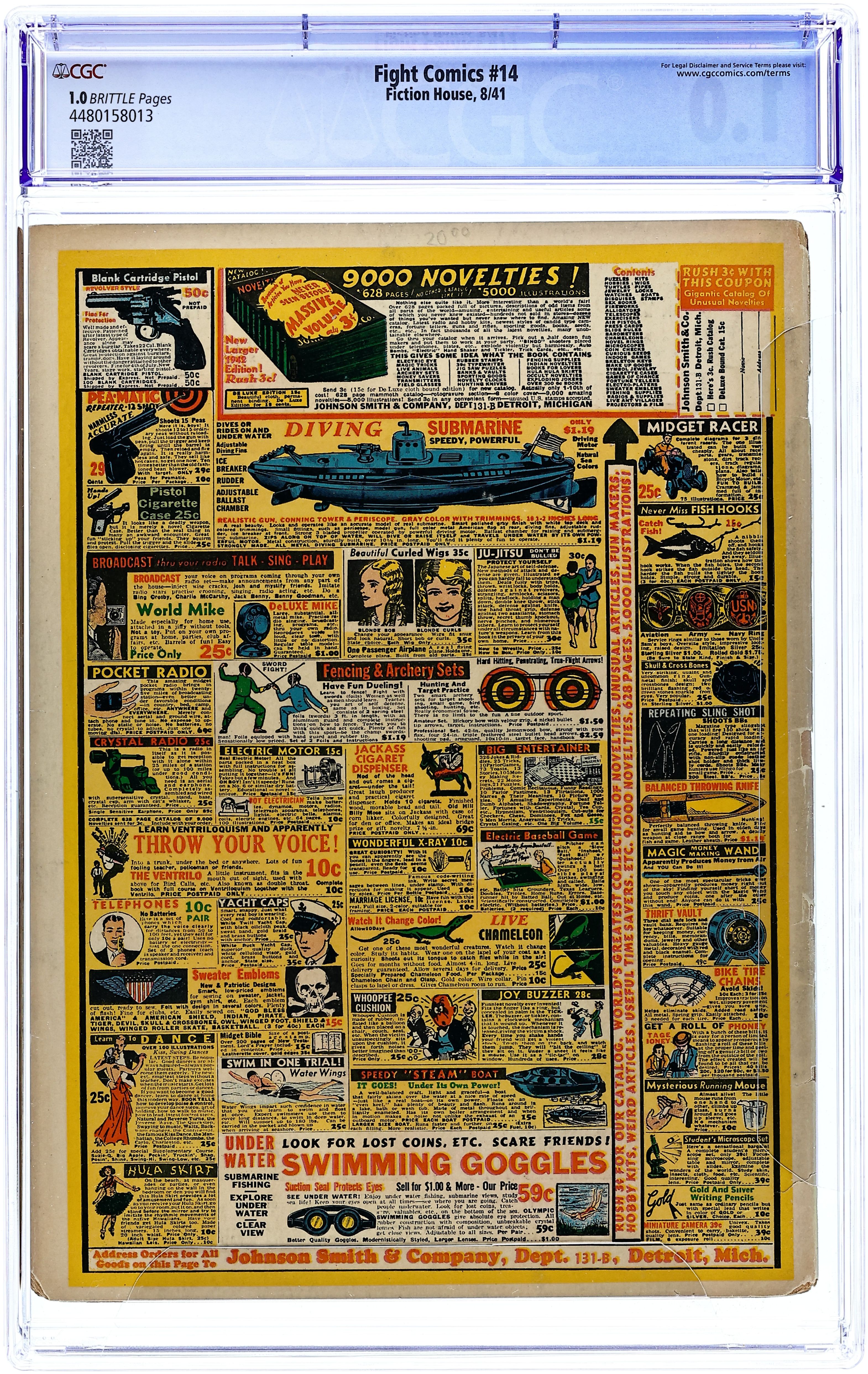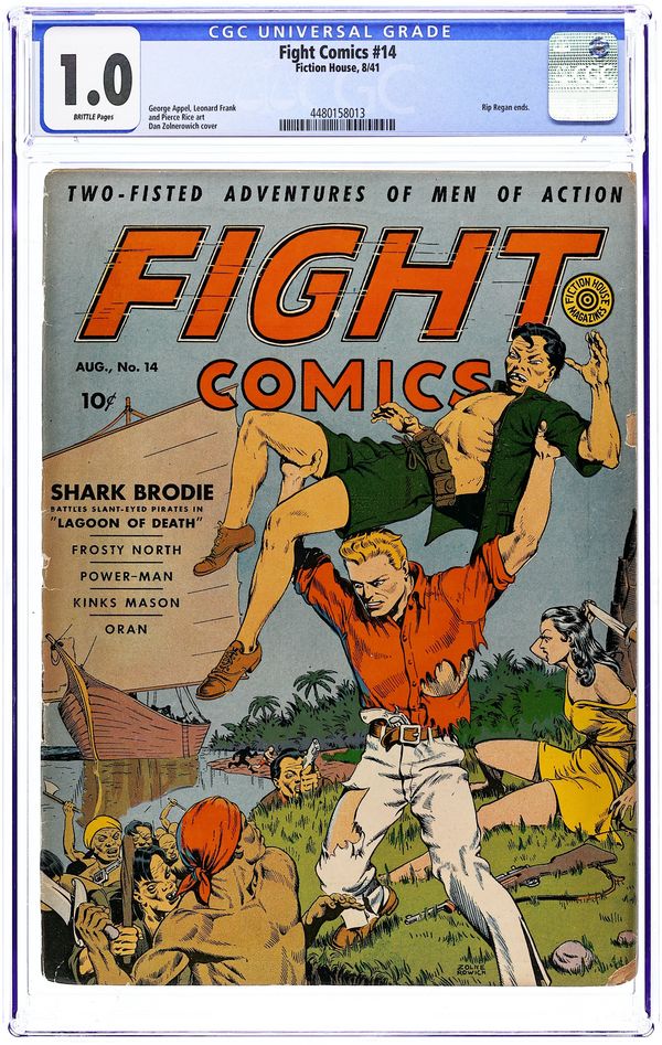 Cover art by Dan Zolnerowich. Untitled story, art by Pagsilang Rey Isip; RAF men prevent invasion of Britain; Chip Collins vs. The Vultures and The Nazis. Untitled story, inks by Emil Gershwin; Mexican oil fields burst into raging infernos; Rip Regan the Power-Man vs. Evil industrialists. "Lagoon of Death" starring Shark Brodie, Capt. Pete Giroux and Miss Geroux; vs. the Japanese. Untitled story, art by Seymour Reit; Strut Warren is still marooned on a south sea; vs. The Nazis and Gen. Von Schmidt. Untitled story; Kayo Kirby vs. Jeff Carson. Untitled story; Spencer Steel vs. Lefty Louie; Biff Flanagan intro. "True Life Story of Jim Jeffries," pencils by Pierce Rice; non-fiction story about the famous boxer. Untitled story; Kinks Mason vs. a gang of poachers. Untitled story, art by Leonard Frank; The Spy Fighter vs. Van Rast; Mohammed Bey introduction. Untitled story; Oran of the Jungle champions the cause of the South American Indian. Untitled story, art by George Appel; Frosty North vs. The Nazis; Skeet Drake introduction. 68 pgs., full color. Cover price $0.10.