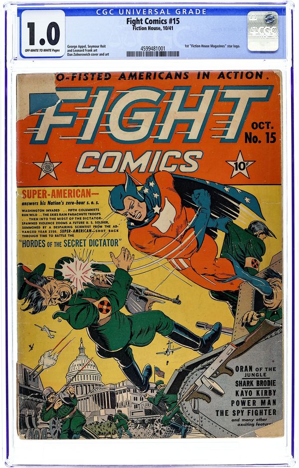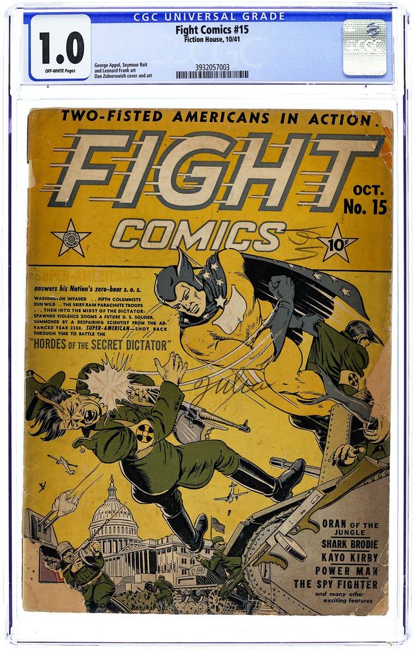 Cover art by Dan Zolnerowich. "Hordes of the Secret Dictator," art by Dan Zolnerowich; Introduction and origin of Super-American; One man against the mad dogs of Europe; Franklin D. Roosevelt appears. Untitled story, art by George Appel; Frosty North vs. reindeer rustlers in Alaska's far-flung wastes. Untitled story, art by Seymour Reit; Strut Warren vs. Kapitan Schnutz Von Bagel. Untitled story; Kayo Kirby vs. Tex Webster. Untitled story; Shark Brodie vs. various Axis spies. Untitled story; Oran of the Jungle vs. Slick Joe Sambo and his syndicate, a cannibal tribe. "The True Life Story of Georges Carpentier"; Non-fiction story about the famous boxer. Untitled story starring Kinks Mason and Battler, his trained seal; vs. the Nazis. Untitled story, art by Leonard Frank; British freighter comes bearing supplies for the army; The Spy Fighter vs. the Nazis. Untitled story; Chip Collins vs. The Nazis. 68 pgs., full color. Cover price $0.10.
