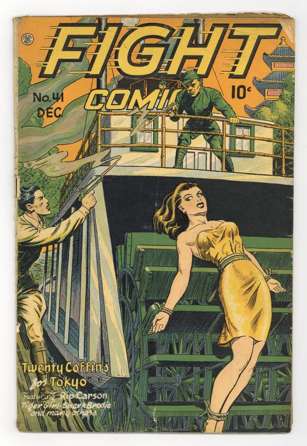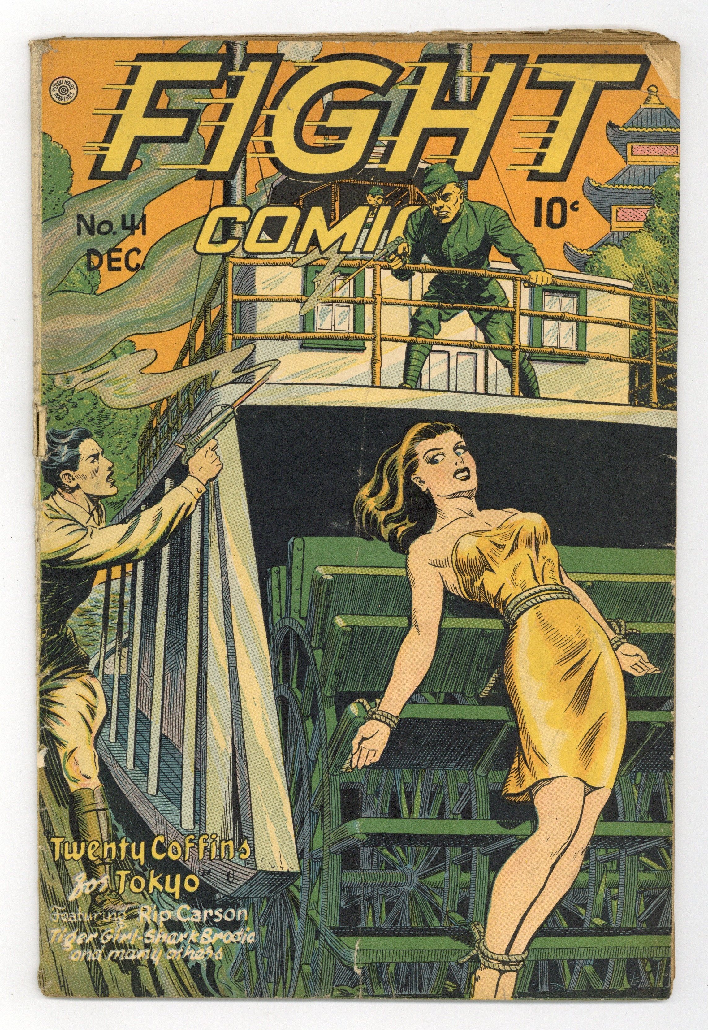Cover by Joe Doolin. Edited by Jack Byrne and Jerry Iger. Stories and art by Robert Webb, Ann Brewster, Alex Blum, Lily Renee and Matt Baker. A combat-themed anthology from Fiction House that featured early work from many future comics legends (often uncredited) in the Eisner-Iger Shop. Tiger Girl battles a mad Dr. Moreau-type who turns jungle animals into half-human creatures; Hooks Devlin investigates a strange murder in the trick-riding ring of a county fair. Glamour-girl turned super-spy Senorita Rio battles escaped Nazi war criminals who plan to replace her with a duplicate. Featuring art by famed good-girl artist Matt Baker and pioneering female artist Lily Renee. Another creative bondage cover, this one involving a paddle-wheel boat. Flying Jeep; Tiger Girl; Rip Carson; Hooks Devlin; Senorita Rio; Shark Brodie. 36 pages, Full Color. Cover price $0.10.