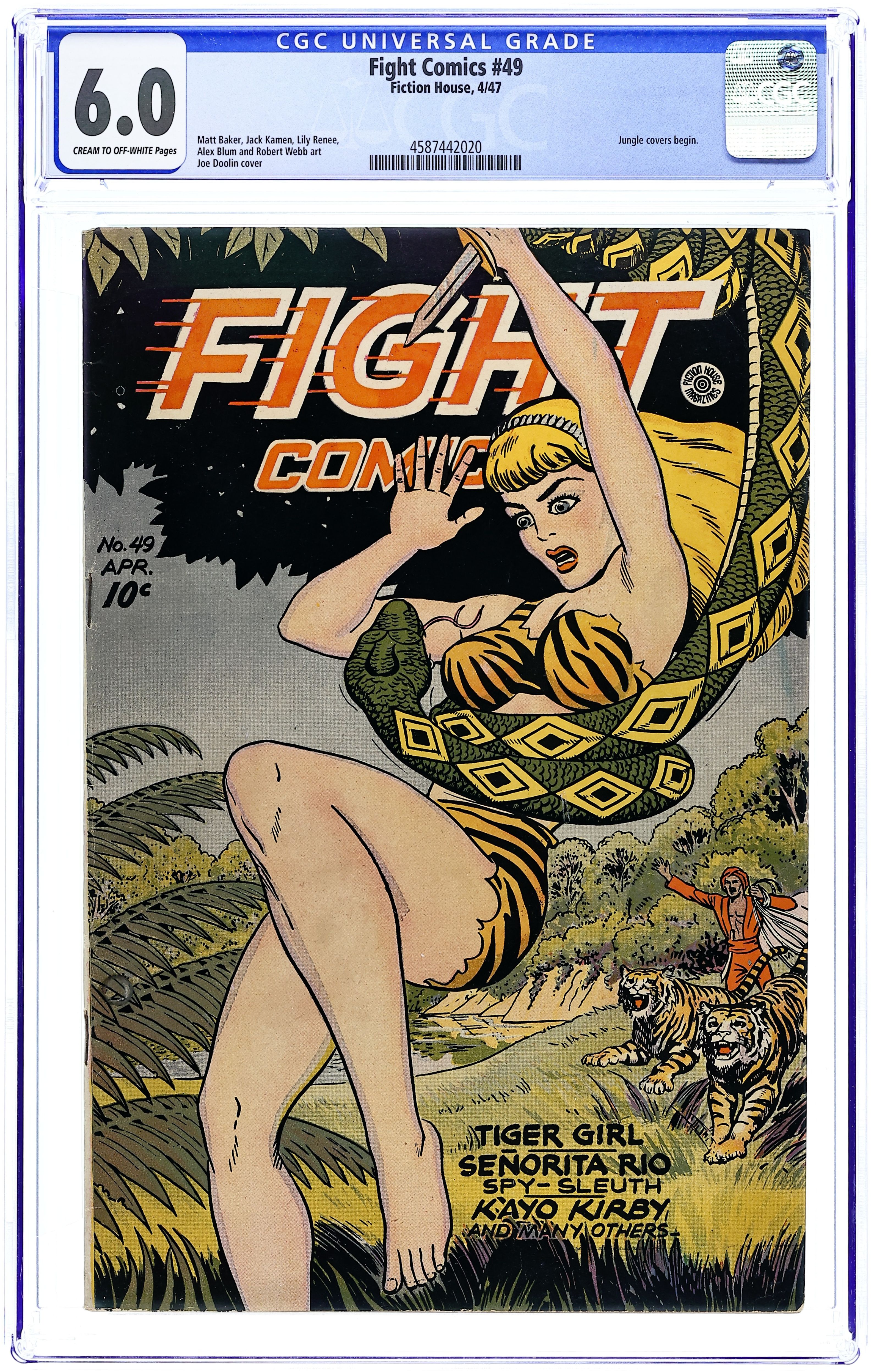 Cover by Joe Doolin. Edited by Jack Byrne and Jerry Iger. Stories and art by Alex Blum, Lily Renee, Robert Webb, and Matt Baker. A combat-themed anthology from Fiction House that featured early work from many future comics legends (often uncredited) in the Eisner-Iger Shop. Slavers target the native population, but not if Tiger Girl has anything to say about it; Good-girl art aplenty as Senorita Rio tracks a mad scientist experimenting on natives in the Amazon jungle; Meg and Black Hart conspire to swindle Captain Fight's ship away from him. The first of many covers featuring Tiger Girl in action. Tiger Girl; Risks, Unlimited starring Rip Carson; Kayo Kirby; Puzzle For a Murderer; Hateful Herman; Hooks Devlin; Senorita Rio; Captain Fight. 48 pages, Full Color. Cover price $0.10.