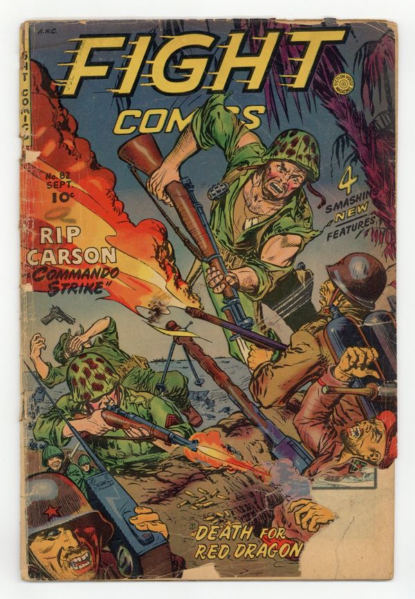 Cover by Maurice Whitman. Edited by J. F. Byrne and Jerry Iger. Stories and art by Ken Battefield and Charles Sultan. A combat-themed anthology from Fiction House that featured early work from many future comics legends (often uncredited) in the Eisner-Iger Shop. As the Korean War heats up, Fight Comics resumes the gung-ho military theme that sustained it through World War II; An American secret agent in France encounters the mystery woman Madam Zero, a female spy working against the Communists; The life of British King Richard the Lionhearted. Death For the Red Dragon; Madam Zero; The Deserter; A Date With Davy Jones; Famous Fighters; Rip Carson. 32 pages, Full Color. Cover price $0.10.